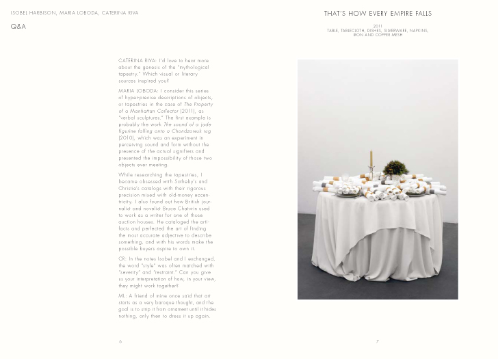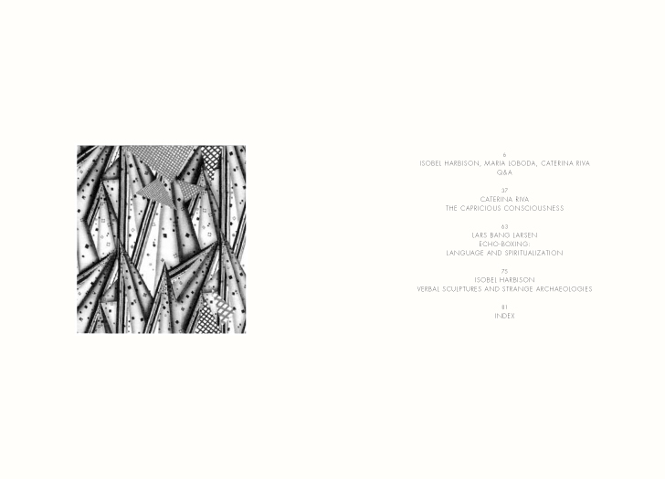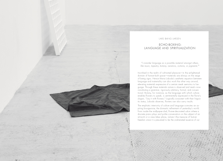 The book contains a Q&A between Loboda, Caterina Riva, and Isobel Harbison, which traces the artist’s work and context. An essay by Riva highlights Loboda’s use of antagonisms, duality, and enigmas in her practice; Lars Bang Larsen points to a state of echoing and spiritualization in Loboda’s works; and Harbison analyzes the engagement with history and artifact in Loboda’s new approach to sculpture.