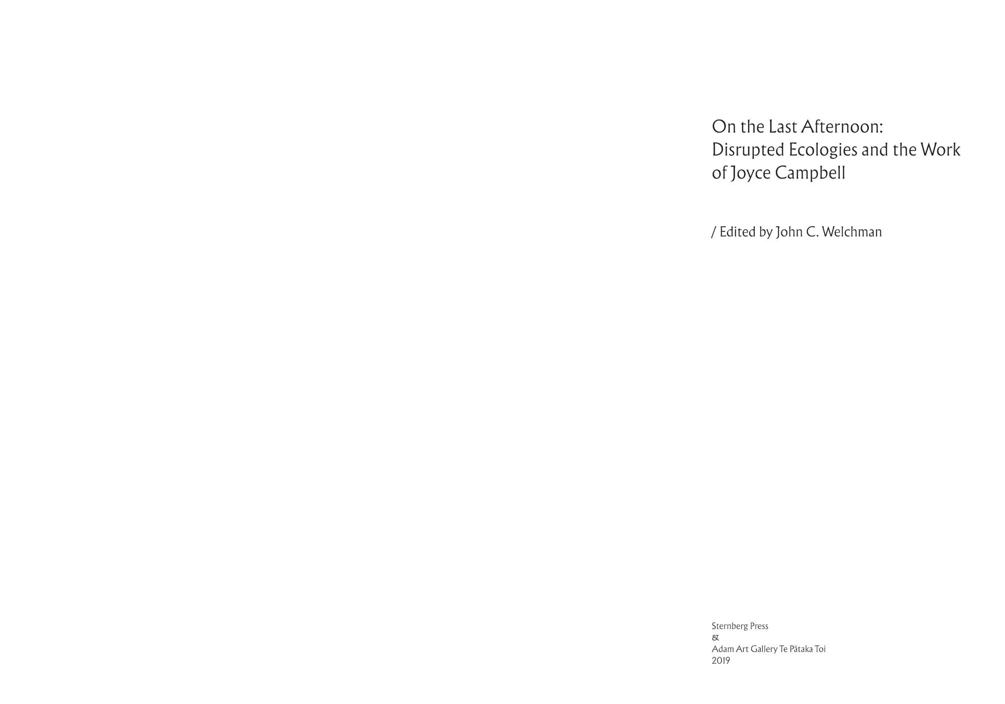 On the Last Afternoon: Disrupted Ecologies and the Work of Joyce Campbell offers a number of portholes into the relations between photography, philosophy, ecology, material history, science fiction, and the care and reading of sacred and symbolic landscapes, as they have been engaged by artist Joyce Campbell over her near three-decade career. Richly illustrated with a full array of her various bodies of work in photography, film, and video, the publication complements and extends her major 2019 exhibition at Adam Art Gallery Te Pātaka Toi in Wellington, Aotearoa New Zealand. Bringing together new and existing writings by Christina Barton, Geoffrey Batchen, Elizabeth Grosz, Richard Niania, Bernard Stiegler, Mark von Schlegell, and John C. Welchman with the embedded wisdom and inherited narratives of her Māori and Pākehā collaborators, Campbell demonstrates the interconnectedness of complex biological, spiritual, and representational systems, and the potential of photography to resist the global techno-capitalist hegemony that underpins the exponential collapse of biodiversity and the decline of spirit in our contemporary era.