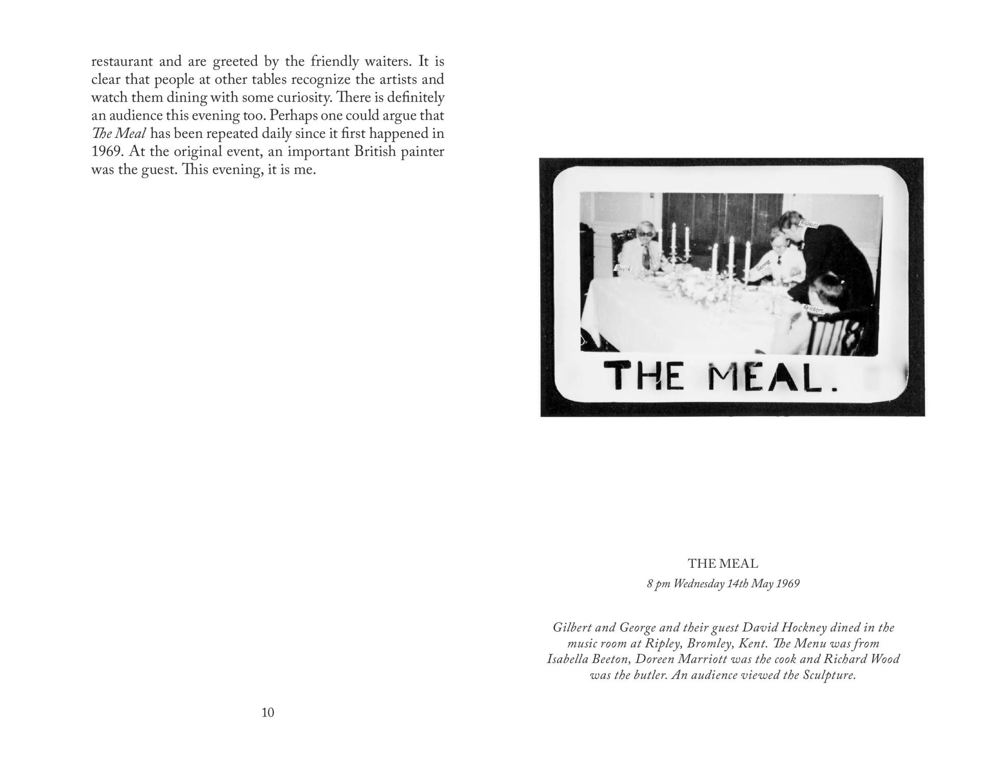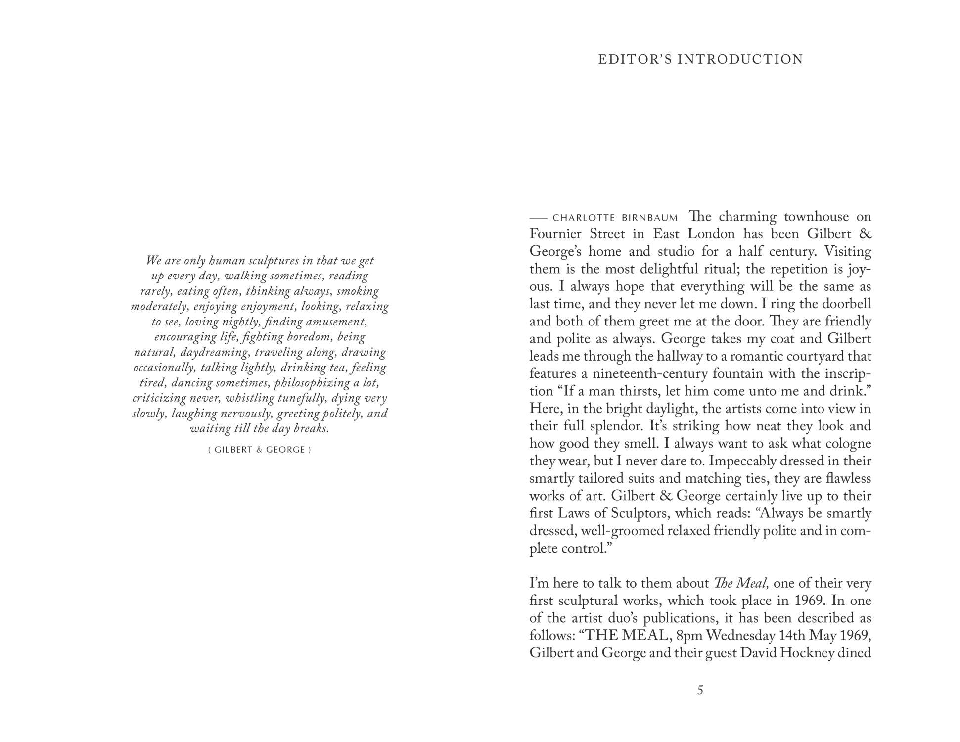 Gilbert & George never cook and always eat out. Back in 1969, however, the artist duo hosted The Meal, an elaborate dinner party that included thirteen guests, Princess Margaret’s butler, a chef who prepared a meal from a Victorian cookery manual, and the guest of honor, artist David Hockney. While the art world of the time was largely characterized by Pop art, Minimalism, and Conceptual art, Gilbert & George developed an entirely unique philosophy and combined their daily lives with their artistic vision; in short, their art and life are one! Charlotte Birnbaum took a trip to London’s East End to visit the immaculately dressed pair to discuss The Meal and other curious projects from their fifty-year collaboration. Also included here are photos and memorabilia from the singular event.