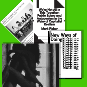 Our third packet includes art-historical chapters from Sven Lütticken’s Cultural Revolution: Aesthetic Practice after Revolution and Josephine Berry’s Art and (Bare) Life: A Biopolitical Inquiry;On Passive Resistance,” a conversation between Vanessa Joan Müller and Cristina Ricupero in New Ways of Doing Nothing; and Mark Fisher’s “We’re Not All in This Together: Public Space and Antagonism in the Wake of Capitalist Realism” from Caring Culture: Art, Architecture and the Politics of Public Health, edited by Markus Miessen and Andrea Phillips.