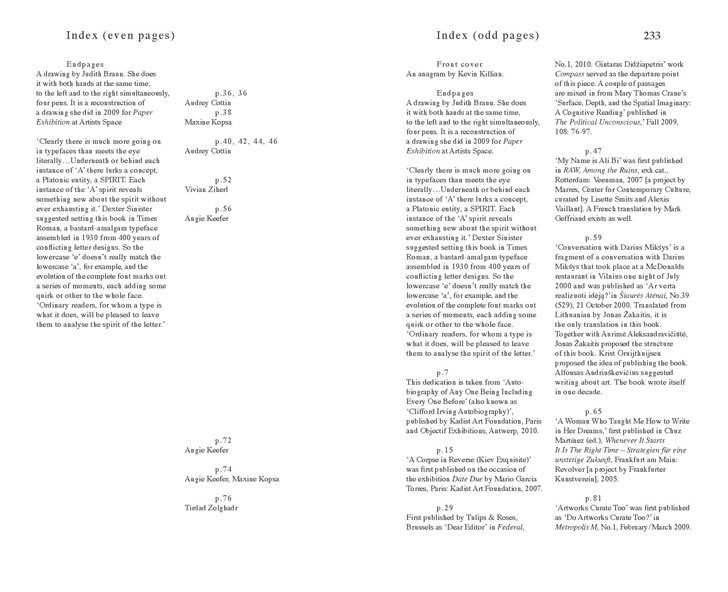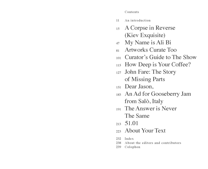 The publication includes texts selected and edited by Aurimė Aleksandravičiūtė & Jonas Žakaitis, Tyler Coburn, Audrey Cottin, Krist Gruijthuijsen, Sofía Hernández Chong Cuy, Virginija Januškevičiūtė, Angie Keefer, Kevin Killian, Maxine Kopsa, John Menick, Vivian Rehberg, Sarah Rifky, Aaron Schuster, Vivian Ziherl, and Tirdad Zolghadr; and features contributions by Judith Braun, François Bucher, Chris Fitzpatrick & Post Brothers, Darius Mikšys, Dexter Sinister, and Lucy E. Smith.