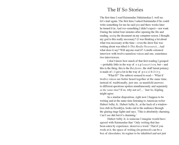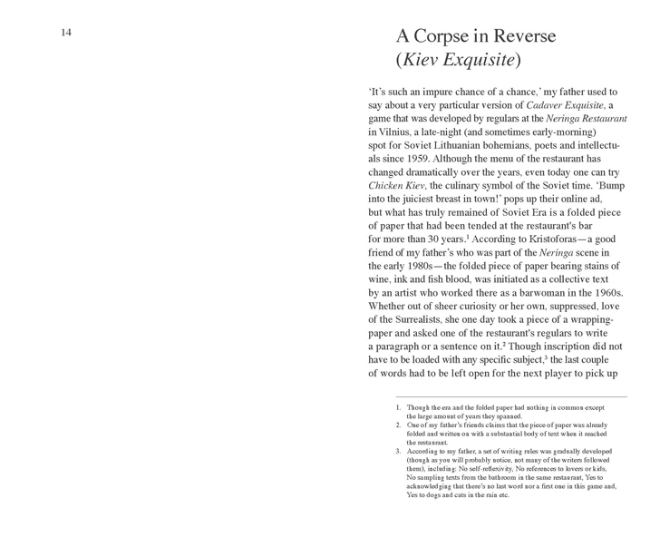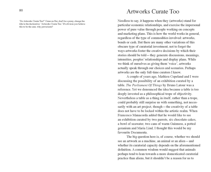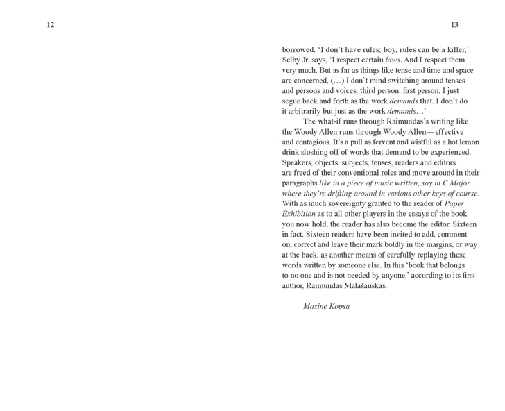 The what-if runs through Raimundas’s writing like the Woody Allen runs through Woody Allen—effective and contagious. It’s a pull as fervent and wistful as a hot lemon drink sloshing off of words that demand to be experienced. Speakers, objects, subjects, tenses, readers and editors are freed of their conventional roles and move around in their paragraphs like in a piece of music written, say in C Major where they’re drifting around in various other keys of course. With as much sovereignty granted to the reader of Paper Exhibition as to all other players in the essays of the book you now hold, the reader has also become the editor. Sixteen in fact. Sixteen readers have been invited to add, comment on, correct and leave their mark boldly in the margins, or way at the back, as another means of carefully replaying these words written by someone else. In this “book that belongs to no one and is not needed by anyone,” according to its first author, Raimundas Malašauskas.