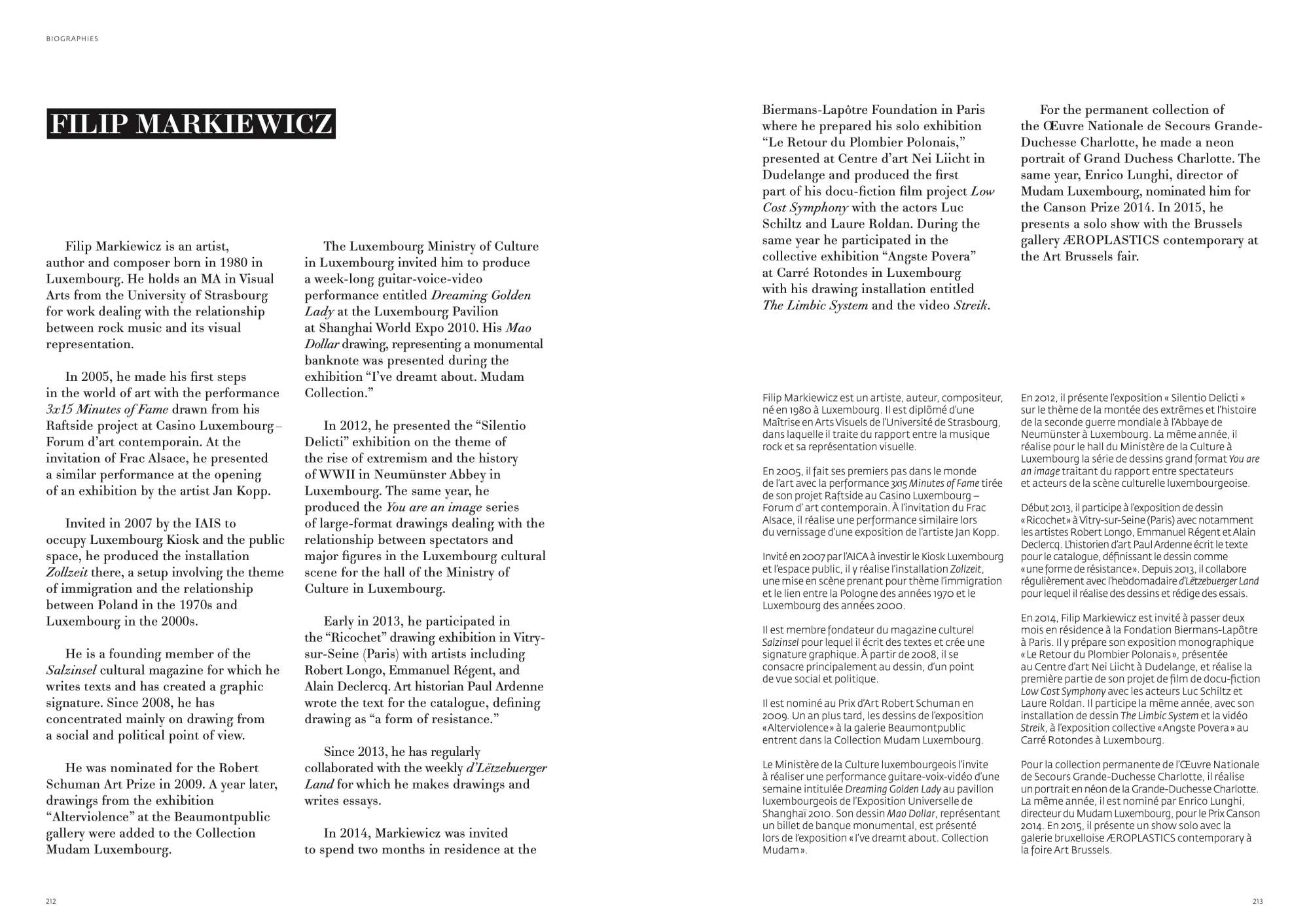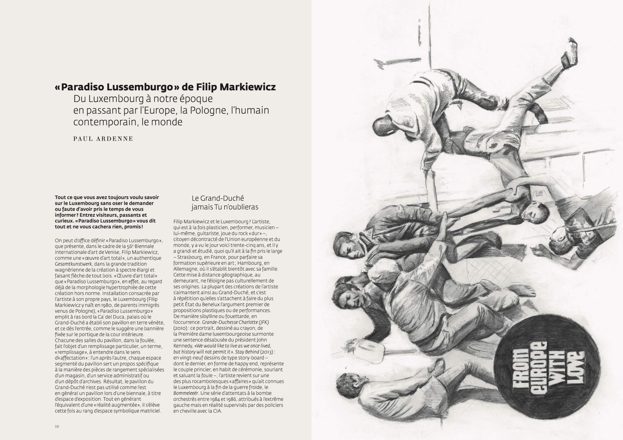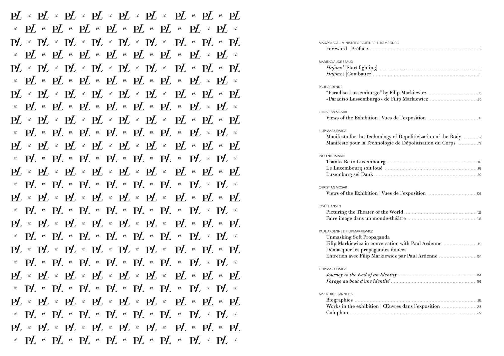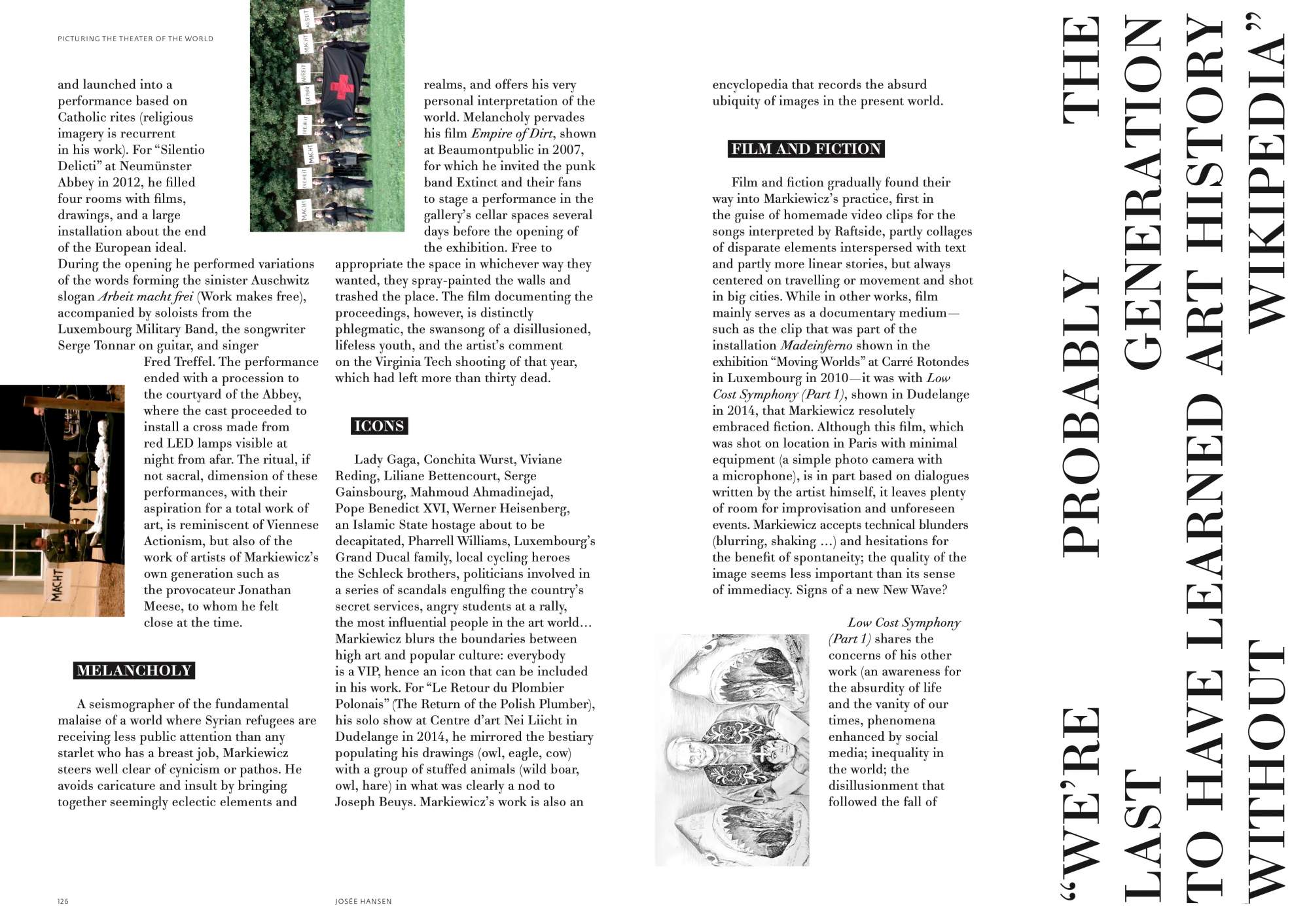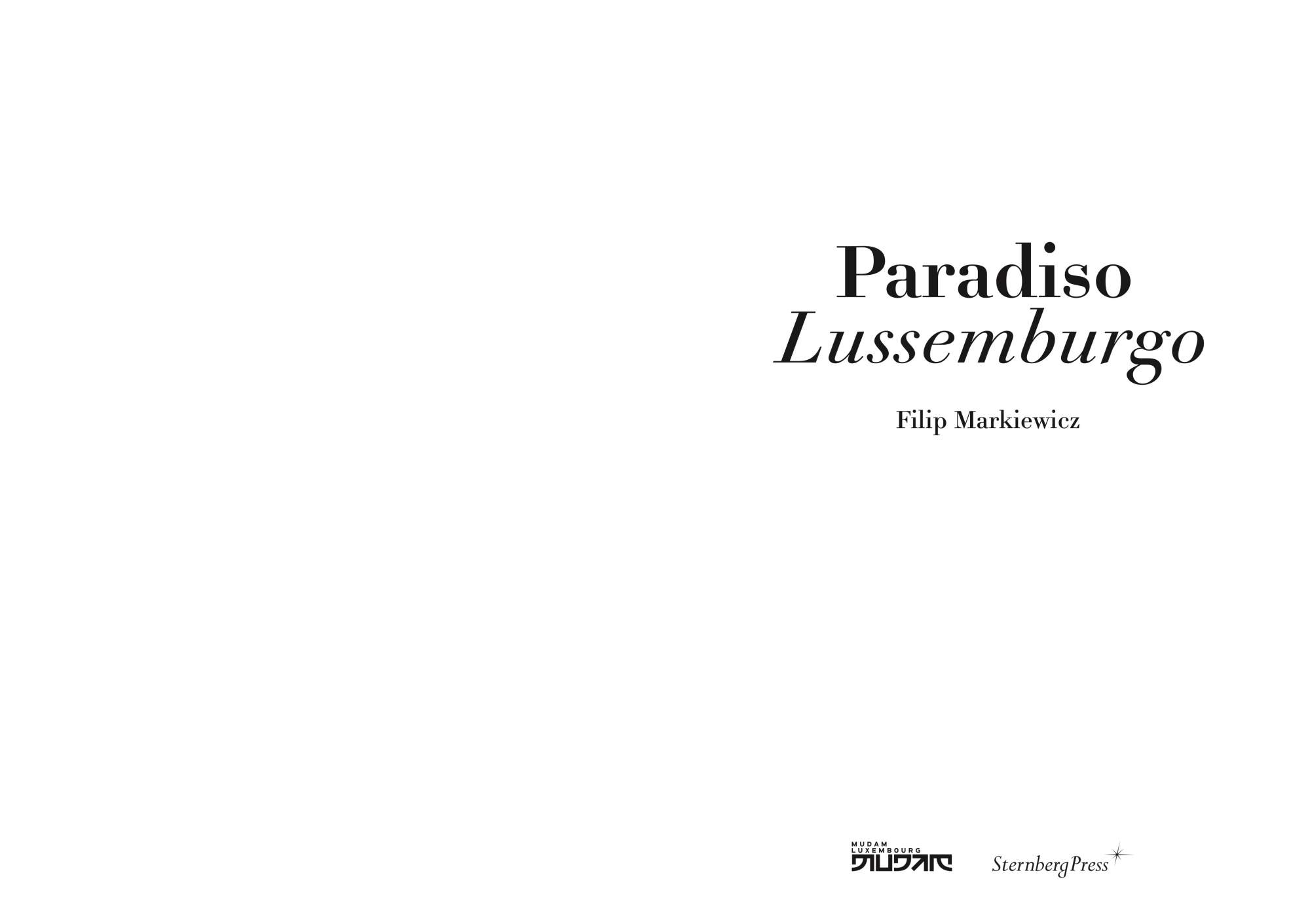 This reader continues, in the words of the artist, this “new contemporary mythology of Luxembourg,” with a bilingual layering of drawings, text and analysis, exhibition views, an interview, and a film script. Paradiso Lussemburgo, a project proposed by Markiewicz and curator Paul Ardenne, creates an active theater, which the reader continues and further opens for participation.