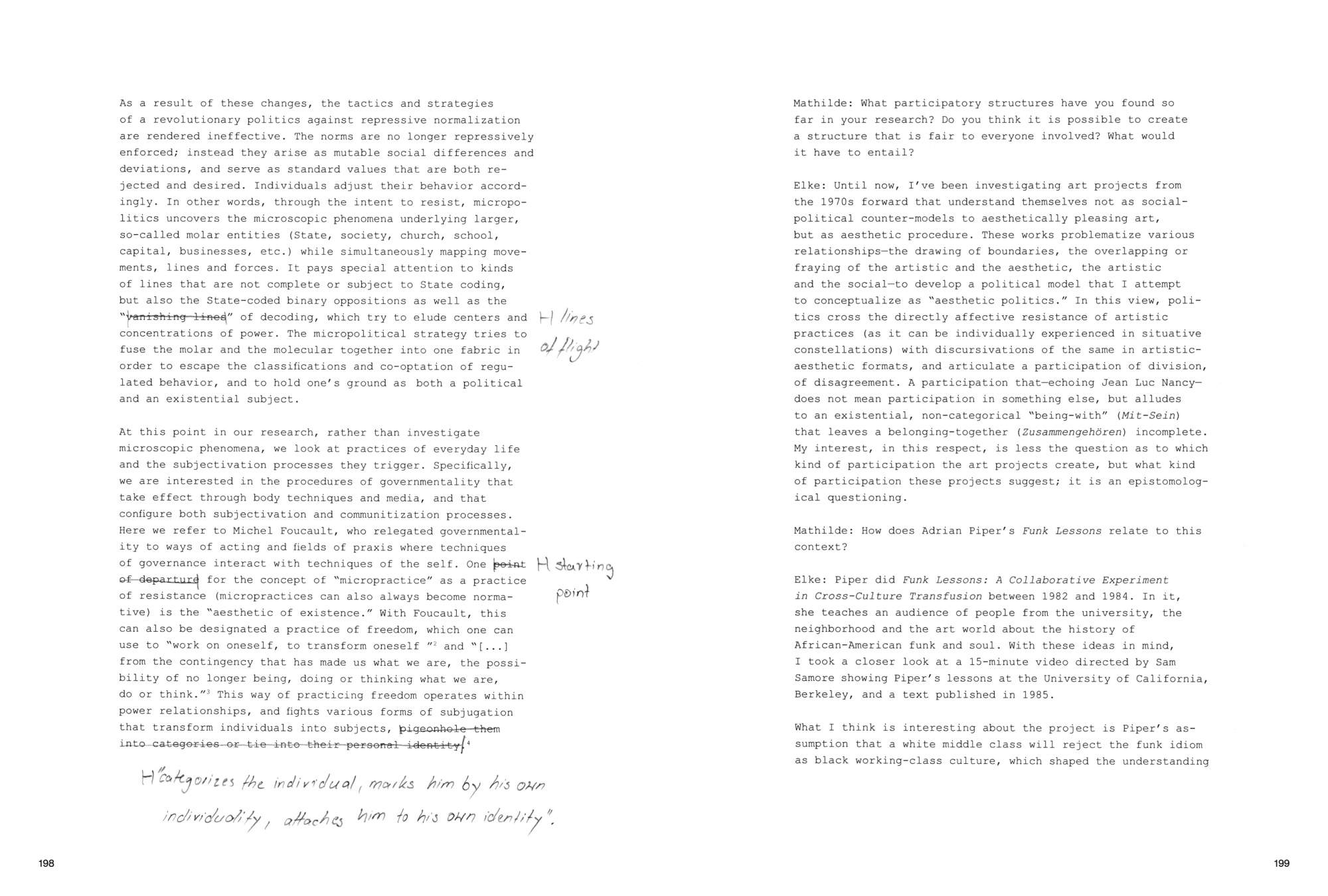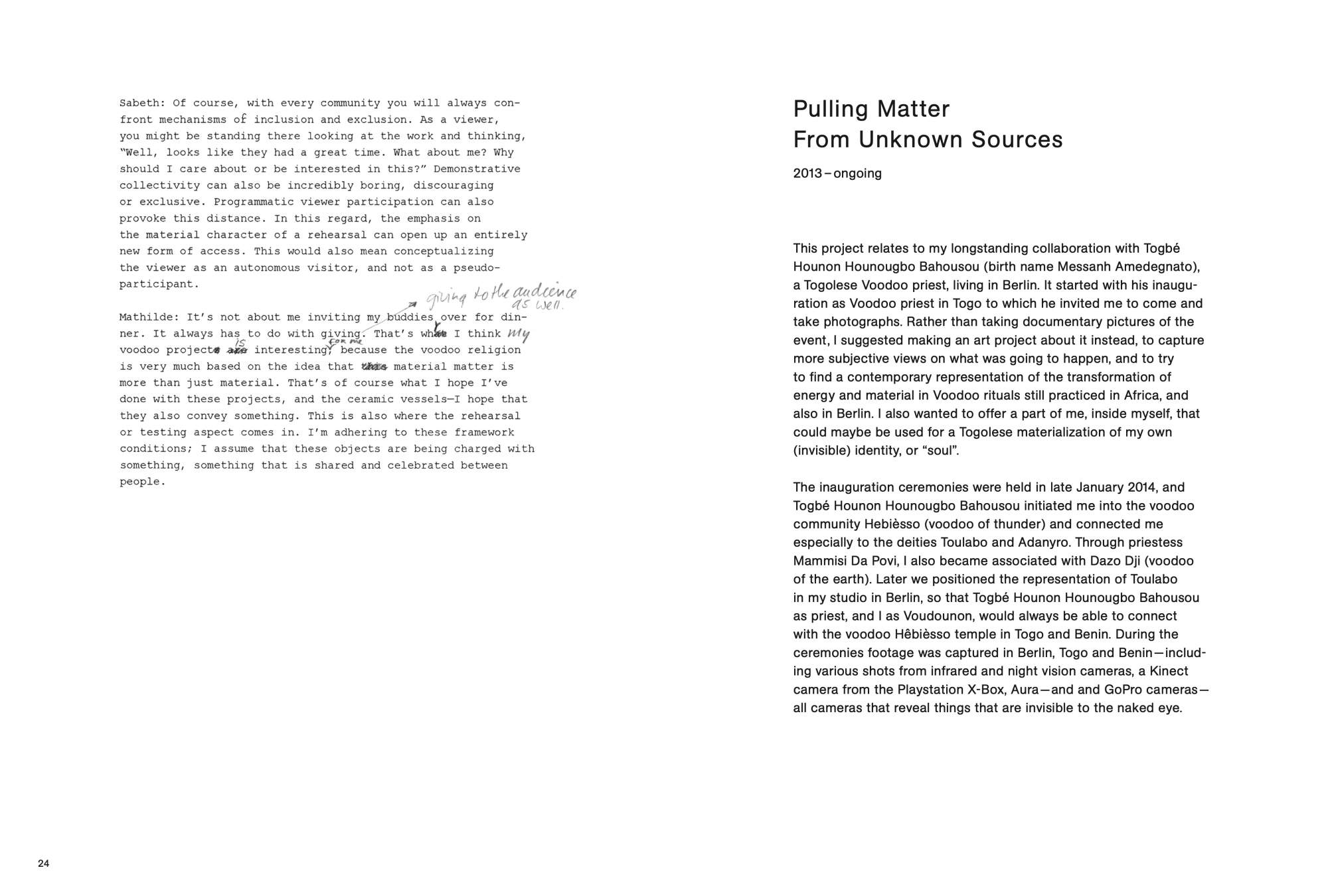 Performing Change, a collection of interviews by artist Mathilde ter Heijne, explores the idea of open-ended, collaborative art processes and their transformative potential beyond the confines of art. Designed as an artist’s book and published in conjunction with her exhibition at the Museum für Freie Kunst in Freiburg (November 8, 2014–February 22, 2015), the book shows handwritten revisions, annotations, and drawings from contributors including voodoo priest Togbé Hounon-Hounougbo Bahounsou and priestess Mamissi DaPovi, women from the Kartal Kadın Ürünleri Pazarı (Women’s Products Market) in Istanbul, ayahuasca shaman and biologist Ulrich Meyerratken, ceremonial magic anthropologist Susan Greenwood and artists, curators and critics Sabeth Buchmann, Anselm Franke, Elke Bippus, Amy Patton, Mark Kremer, Janne Schäfer, and Kristine Agergaard, with a preface interview by Museum für Freie Kunst curators Christine Litz and Sophia Trollmann.