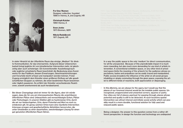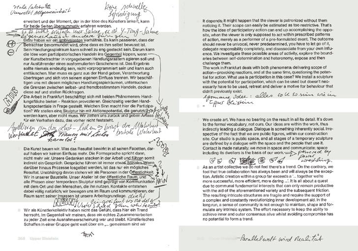 In Playing the City: Interviews, Matthias Ulrich, curator of the Schirn project, asks fifty-one of the involved artists ten central questions about the participatory and collaborative art context. Their answers and comments provide a telling picture of the multiple forms of interactive, cooperative, and interdisciplinary practices in contemporary art.