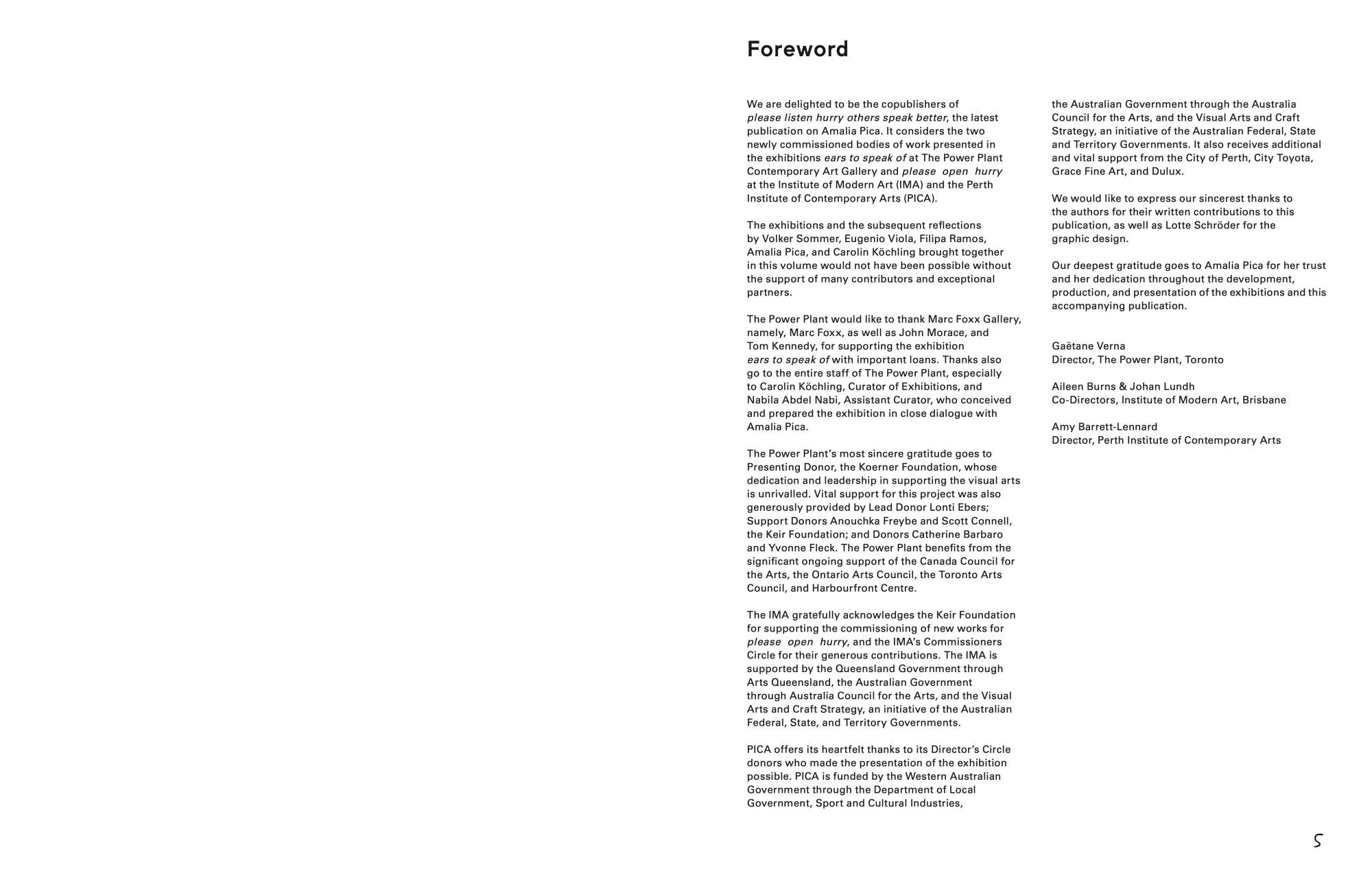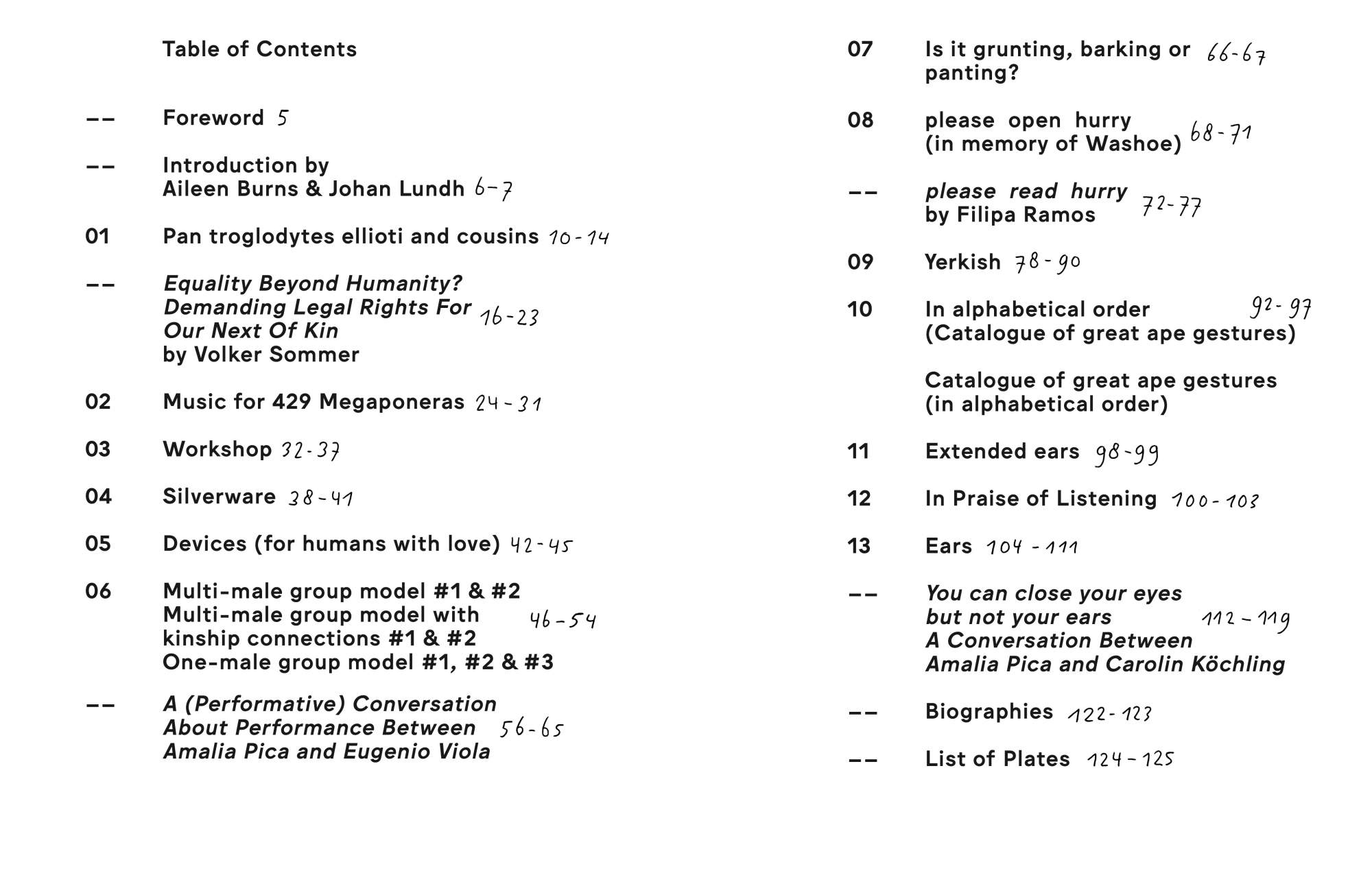 The catalogue please listen hurry others speak better accompanies solo exhibitions by Amalia Pica at three venues: “ears to speak” at The Power Plant gallery in Toronto and “please open hurry” at the Institute of Modern Art, Brisbane, and Perth Institute of Contemporary Arts. Two threads in Pica’s practice are brought together: communication between humans and exchange between species. The artist raises questions of mutual understanding through constructing forums that address shared experience. Illustrations of primate and human social models and interpersonal communication in the publication are accompanied by documentation of performances that enact social hierarchies and animal-language studies. Volker Sommer writes about his work on animal rights and the initiative to establish a “community of equals,” and Filipa Ramos reflects on primate anthropologists Jane Goodall and Gregory Bateson. A conversation between Carolin Köchling and Pica considers her artistic practice, and Eugenio Viola and Pica discuss the performative element of the artworks.