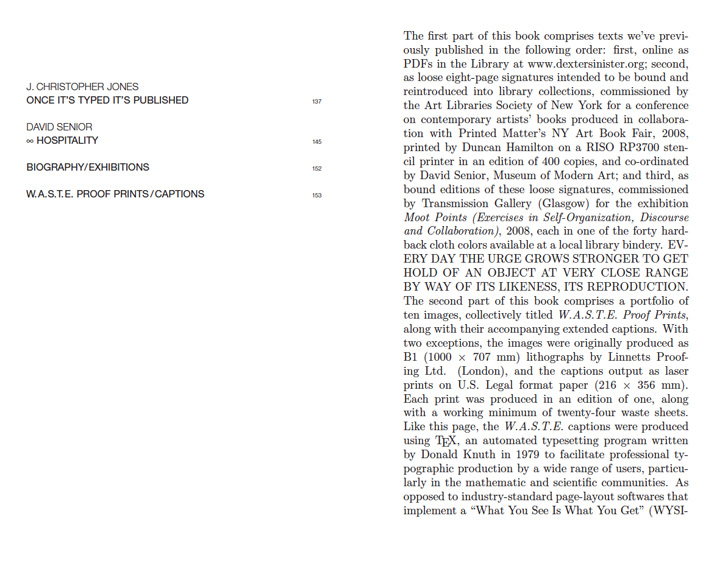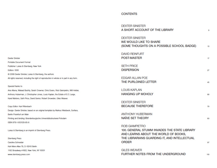 Over the past few years, Dexter Sinister has been interested in exploring contemporary publishing in its broadest, most exploded sense. The first part of this book consists of pieces of writings written since the conception of their New York basement workshop and bookstore in the summer of 2006. These writings were previously published online as PDFs in the Library at www.dextersinister.org. They were primarily written by Dexter Sinister or by one of a circle of regular collaborators, often for their house journal Dot Dot Dot, or as supplements to other books or exhibitions.