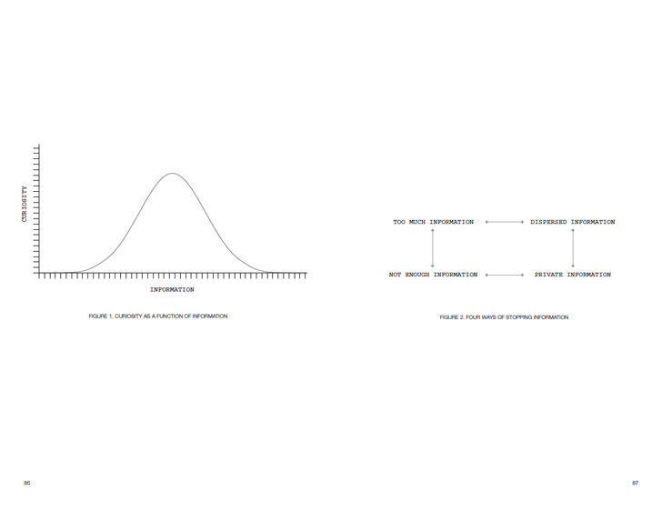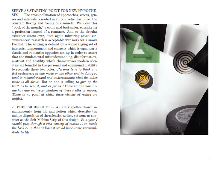 The second part consists of reproductions of a series of lithographic proof prints. Accompanying these prints are extended captions individually produced for different exhibitions in 2008. Each caption was composed in line with the manner of its accompanying image. Although never intended as a set, a number of generic themes emerged, such as abstraction, mathematics, logic, and cooperation. The book intends to demonstrate how ideas from the first part have been rechannelled in the second.