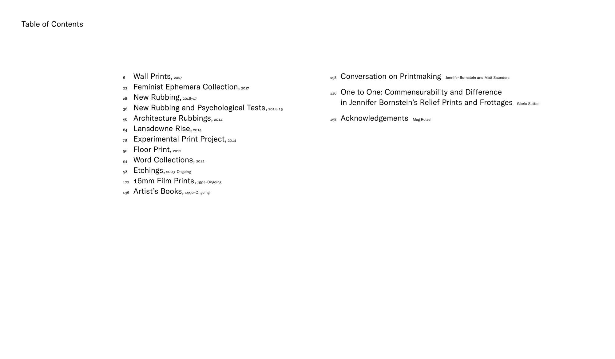Prints by Jennifer Bornstein gathers together a body of work encompassing her latest projects in printmaking during a recent fellowship at the Radcliffe Institute for Advanced Study at Harvard University. These works are contextualized by earlier projects in drawing, film, and artist books that span the 1990s to the present. Known for her conceptual approach, Bornstein’s current works centering around prints and frottages weave together intricate background stories of family relations, feminist history, and material possession that are inscribed in wry yet complex understandings of technological presence and material trace. Generously illustrated with detailed images, the book also features an essay by Gloria Sutton and an interview between Bornstein and artist Matt Saunders.