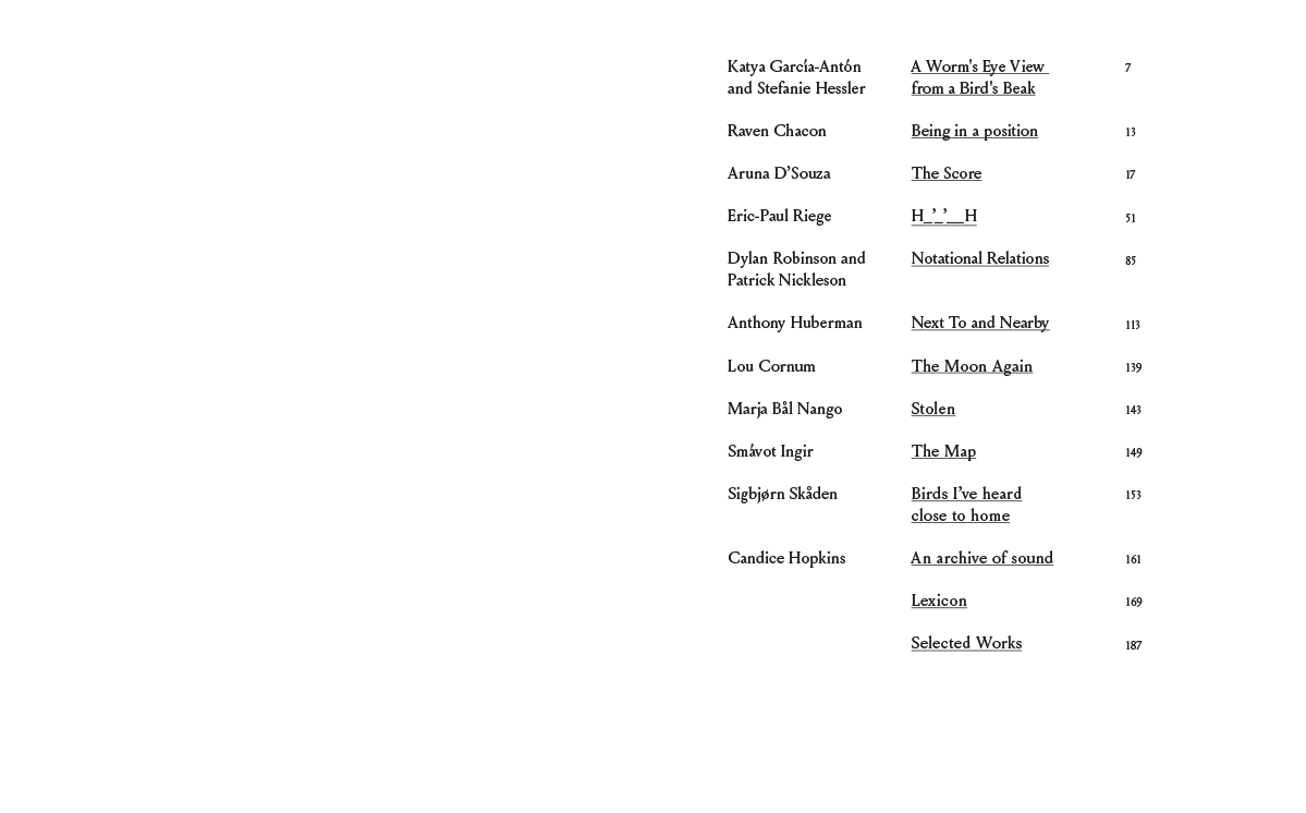 The publication features newly commissioned texts including three long-form essays by Aruna D'Souza, Anthony Huberman, and Dylan Robinson/Patrick Nickleson; experimental short-form writing by Raven Chacon, Lou Cornum, Ingir Bål Nango, Marja Bål Nango, Eric-Paul Riege, Ánde Somby, and Sigbjørn Skåden; an introduction by Katya García-Antón and Stefanie Hessler; and a conclusion by Candice Hopkins.