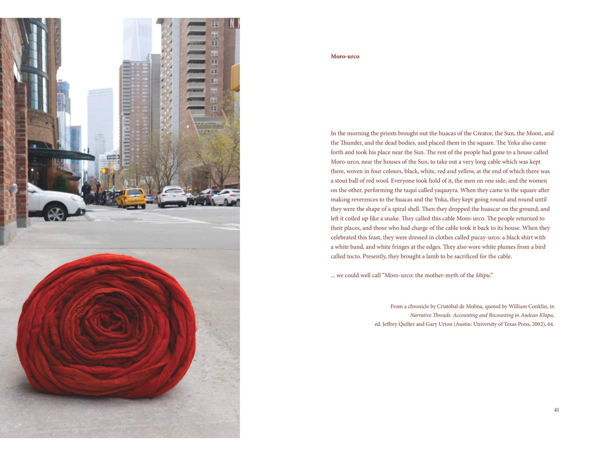 Appearing on the occasion of Vicuña’s installation in Athens for documenta 14, Read Thread tells the story of the sanguine thread in Vicuña’s work. A tension arises in the asymmetry of Andean weaving and the artist’s quipus—large-scale immersive installations of thread, wool, and yarn that reference the pre-Columbian language of knotting, a type of weaving-as-writing. Vicuña’s translation of the quipu into a spatial and performative poetics conveys the tension of ecological disaster and reparation as well as a bodily sense of the cosmic scale of landscape, history, and time.