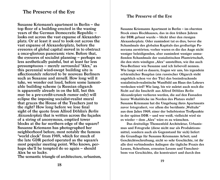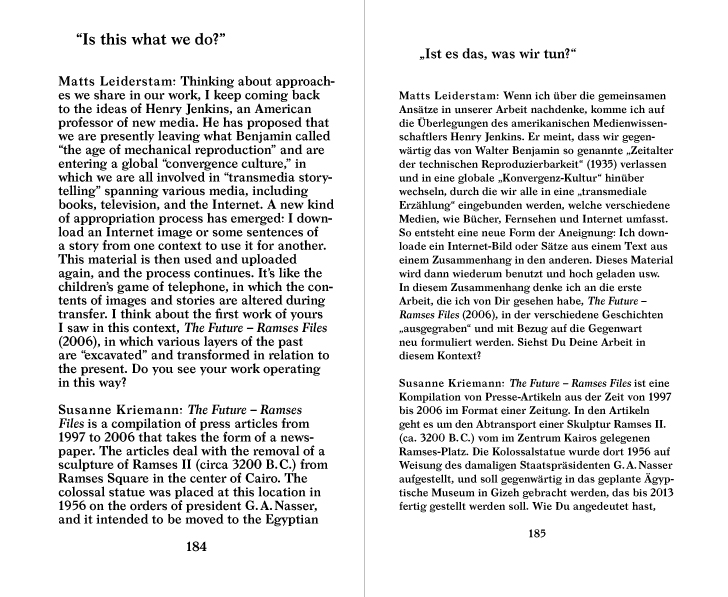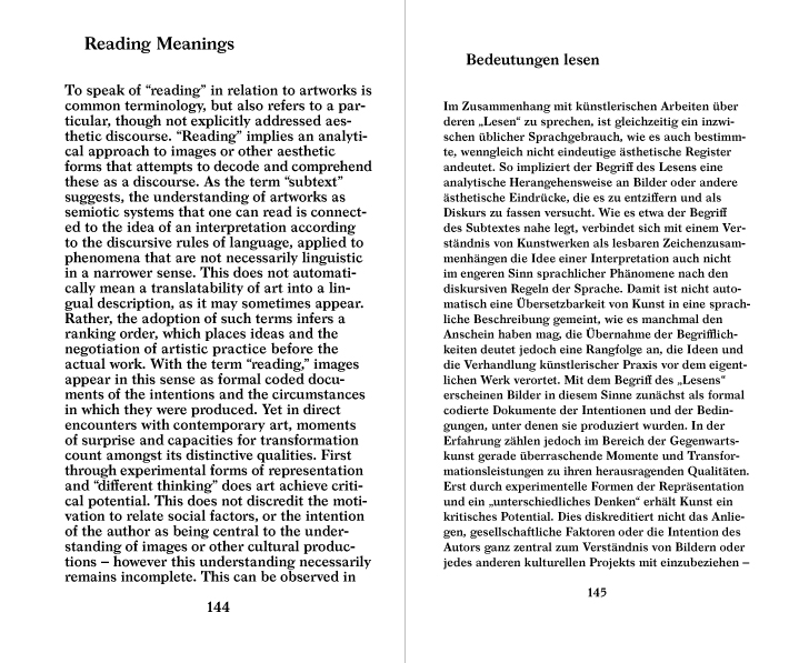 The book is comprised of texts on Susanne Kriemann’s practice and its relation to the concept of Reading in a wider sense: reading photographs, archives, and texts and transforming these into new compositions with photography, urban space, and historiography. Nine authors have approached intertextuality’s various manifestations and meanings and in doing so, confront the notion of reading (of text, image, object, context). The authors trace the permeation of the intermedial in Susanne Kriemann’s work in various ways. Quotes from writers, scientists and journalists dispersed throughout the book touch on themes present in the Susanne Kriemann’s work, both deepening as well as linking it to the current discourse of art in general.