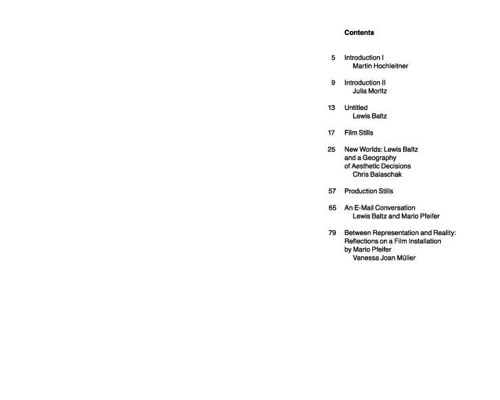Over the last four decades, Lewis Baltz has continuously produced high quality photographic books. This publication functions as a critical reader, reevaluating “New Topographics” as representations of landscapes. Looking at Pfeifer’s installation, which revisits a Baltz’s photographic site, Vanessa Joan Müller negotiates the terms realism/reality and the way Pfeifer discovers the misrepresentation of a modern industrial building in Irvine’s Industrial Park in 2009. Martin Hochleitner contextualizes Pfeifer’s film installation within the context of the original “New Topographics” exhibitions (1975), which, since 2009, are being shown throughout the United States and Europe. In addition, this publication consists of film stills, production stills, and a rare interview by Mario Pfeifer with Lewis Baltz. It was published on the occasion of Mario Pfeifer’s contribution for the “New Topographics” exhibitions at Los Angeles County Museum of Art and Landesgalerie Linz in 2010.
