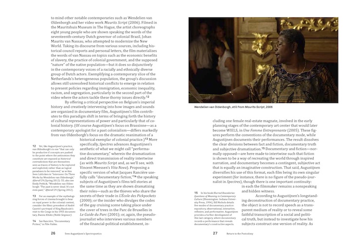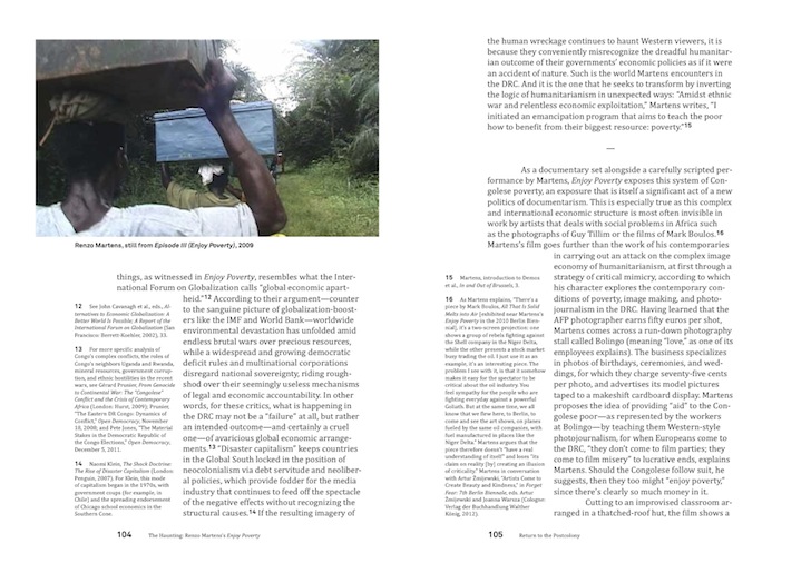 In the wake of failed states, growing economic and political inequality, and the ongoing US- and NATO-led wars for resources, security, and economic dominance worldwide, contemporary artists are revisiting former European colonies, considering past injustices as they haunt the living yet remain repressed in European consciousness. With great timeliness, projects by Sven Augustijnen, Vincent Meessen, Zarina Bhimji, Renzo Martens, and Pieter Hugo have emerged during the fiftieth anniversary of independence for many African countries, inspiring a kind of “reverse migration”—a return to the postcolony, which drives an ethico-political as well as aesthetic set of imperatives: to learn to live with ghosts, and to do so more justly.