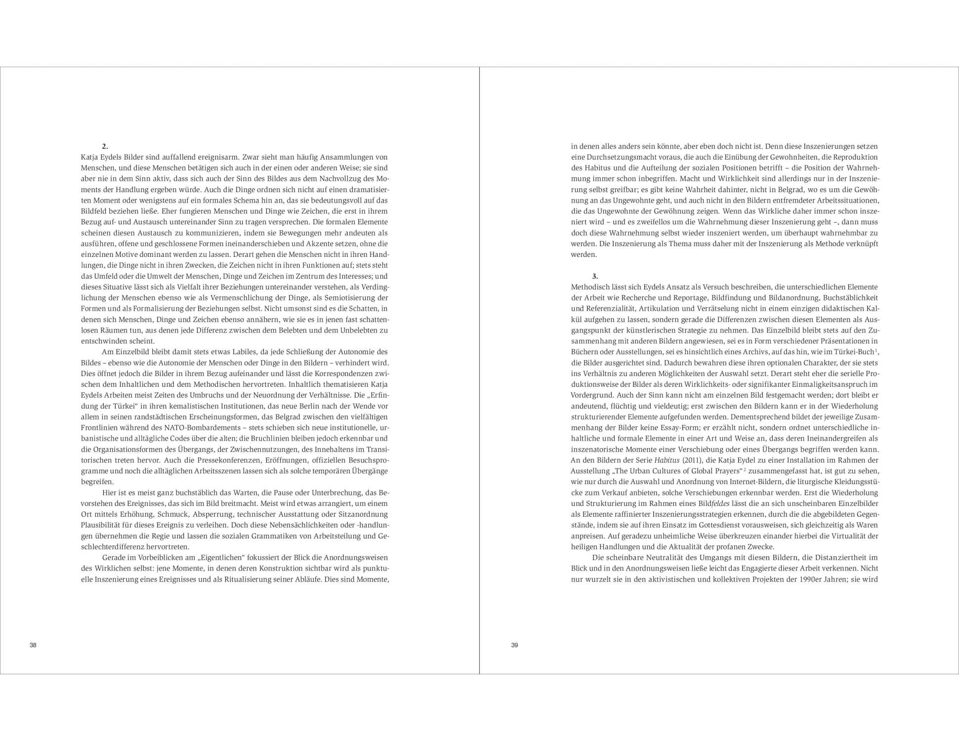 This publication presents artist Katja Eydel’s photographic body of work. The photos were selected for the book from her many series, and highlight a thematic continuity and visual language that position her work. The individual projects focus on different environments that are often characterized by crisis—mostly dealing with communities and their fringes, with proxies and symbolic representations, as manifested, for example, in forms of protest or religious garments.