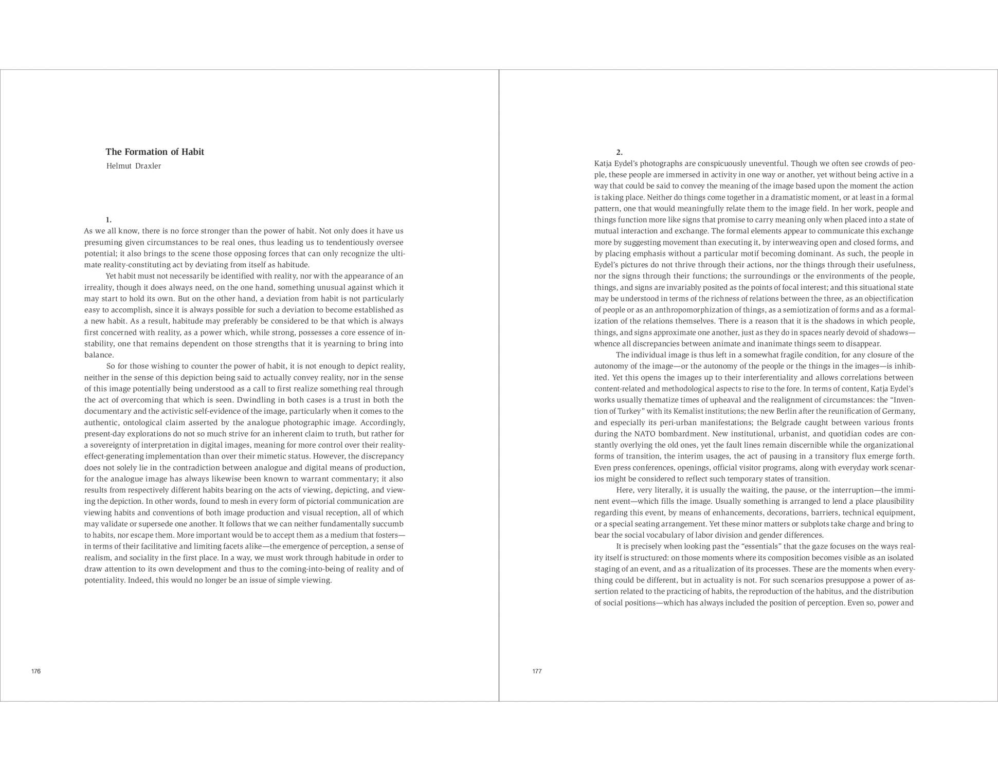 In Eydel’s images, modes of human coexistence form into spatial structures and social frameworks. The visual order of these aesthetic surfaces leads to conclusions about underlying notions and theories; as such, they always also refer to the identities of individuals and possible alternatives to reality. The ostensible objectivity of Eydel’s photographic language opens up a crucial space for the viewers. The representation of reality and the spatial logic of the image as a representative instrument are also questioned.
