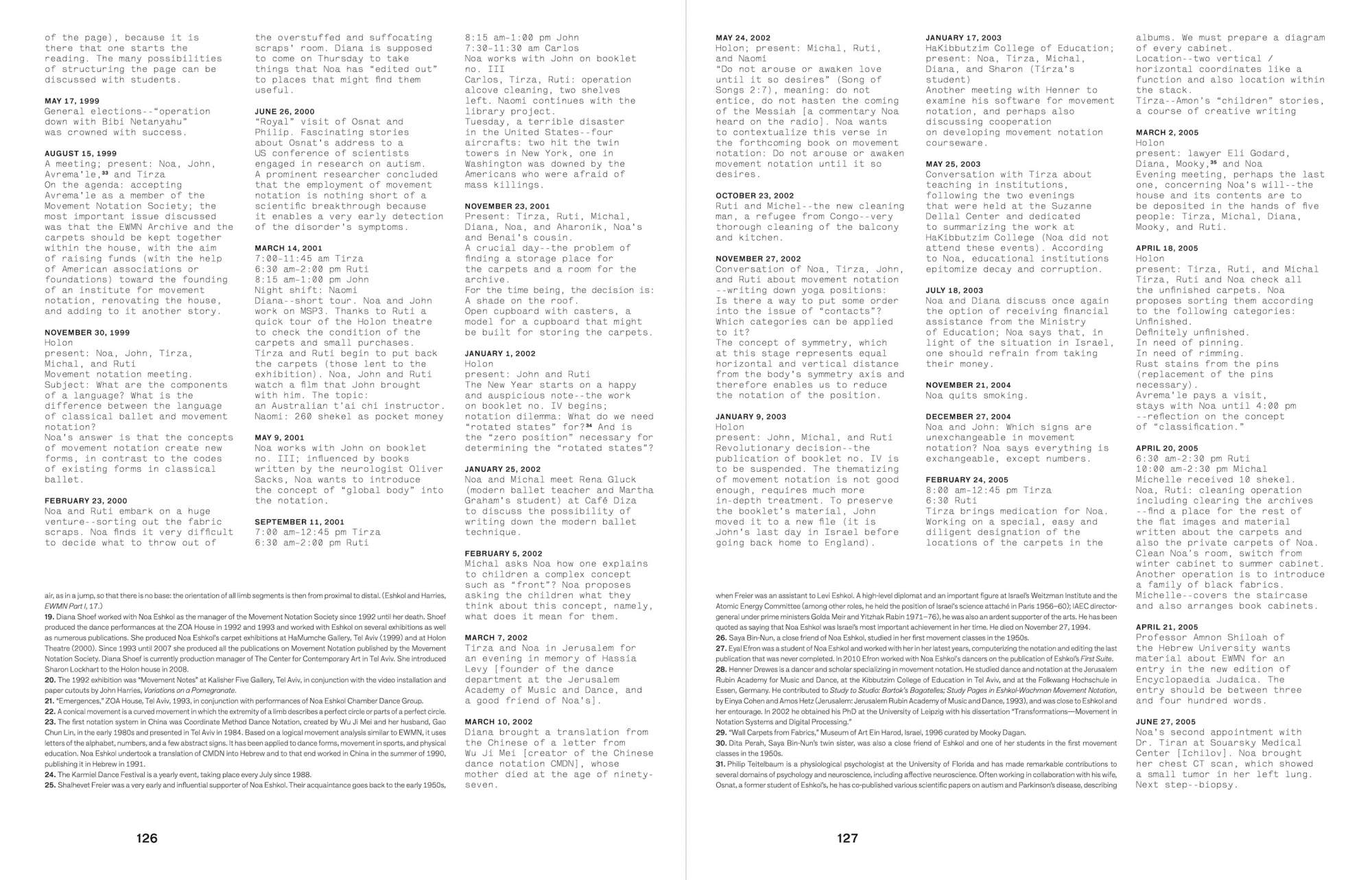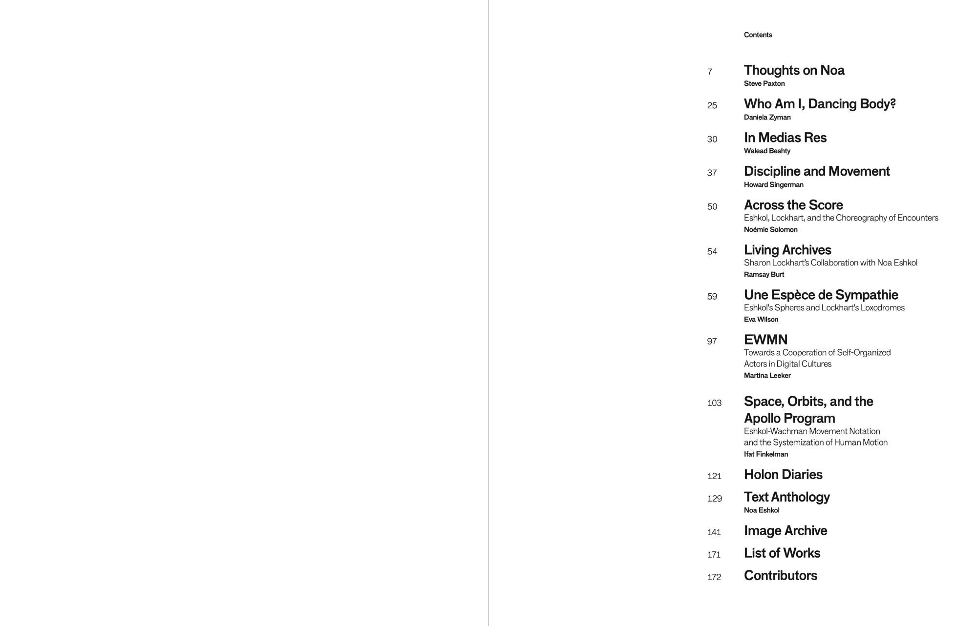 The catalog Sharon Lockhart | Noa Eshkol accompanies the eponymous exhibition at TBA21 – Augarten in Vienna by Sharon Lockhart (November 23, 2012–February 24, 2013) which consists of a complex installation of videos, photographs, and archival material, composing a subtle and sensuous portrait of the Israeli choreographer, dancer, researcher, and textile artist Noa Eshkol (1924–2007). The book features nine essays, installation photographs of the works on show, film stills, archival material from the Noa Eshkol Foundation (notations, journals, notes), and wall carpets by Noa Eshkol.