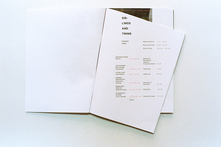 Siblings and Twins, a catalogue of Haegue Yang’s installation works, documents the same-titled exhibition held at Portikus, Frankfurt am Main. The exhibition was part of a serial project designed by Yang in which she staged additional installations in other international exhibition sites. The works are formally distinct but are connected by metaphorical parallels. Yang’s current works are based on the lives of a variety of historical characters marked by an intense struggle with their own fate in pursuit of their political ideals. In the case of “Siblings and Twins,” shown at Portikus, Yang worked with two heroes: Kim San, the fighter for Korea’s freedom, and the French author Marguerite Duras. Yang is distinguished by her ability to place abstractly conceived, complex states of affairs in the world into a self-supporting language of formal abstraction.