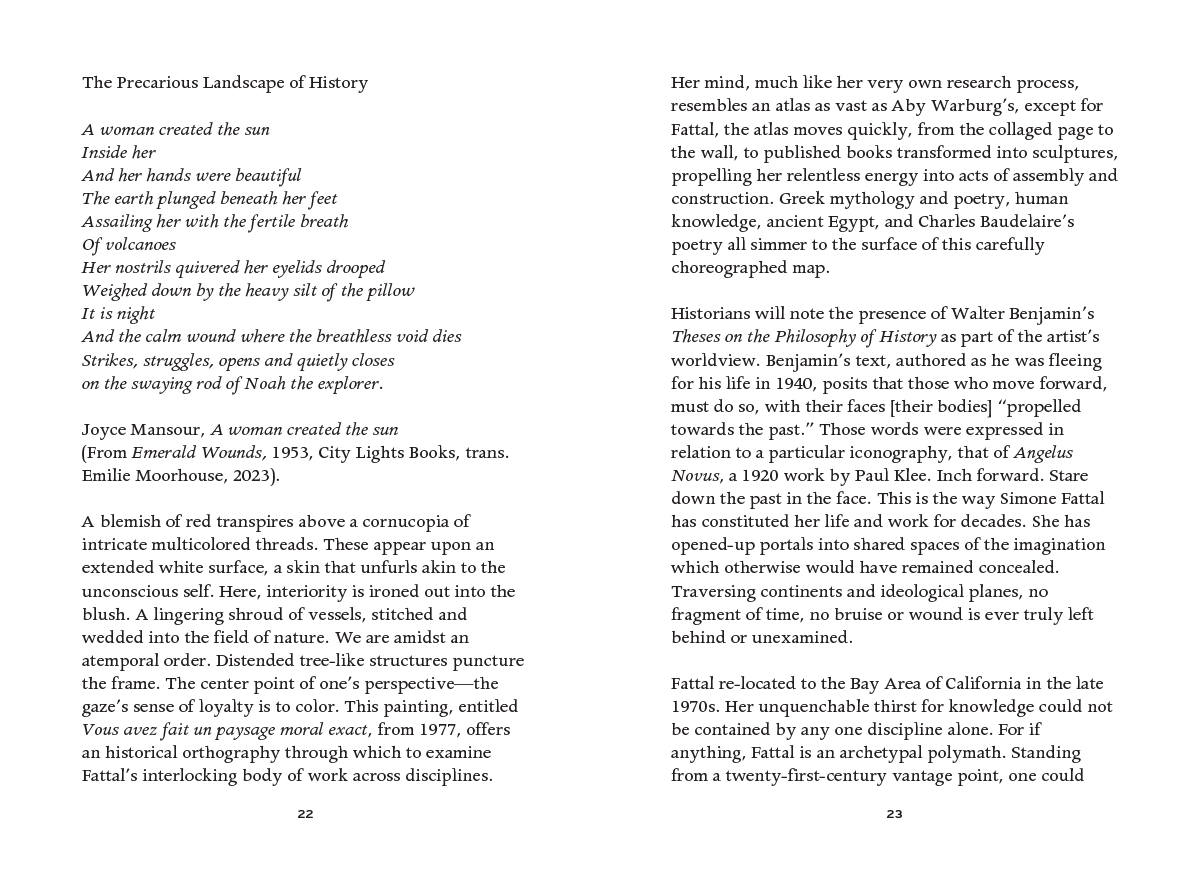 For over five decades, Simone Fattal (b. 1942, Damascus) has eschewed singular form or subject in her wide-ranging artistic practice. In this deeply personal biography, Fattal’s close friend and confidante Hans Ulrich Obrist journeys with the artist across physical borders and through seats of imagination. Together they discuss the artist's remarkable early life in Syria, her coming-of-age in Lebanon, as well as her transcultural life in France. Wartime memory and exile in California, sow the seed for discussions regarding archaeology, history, and mythology.