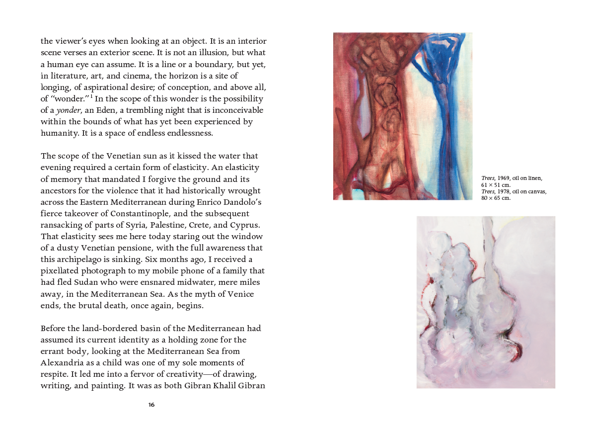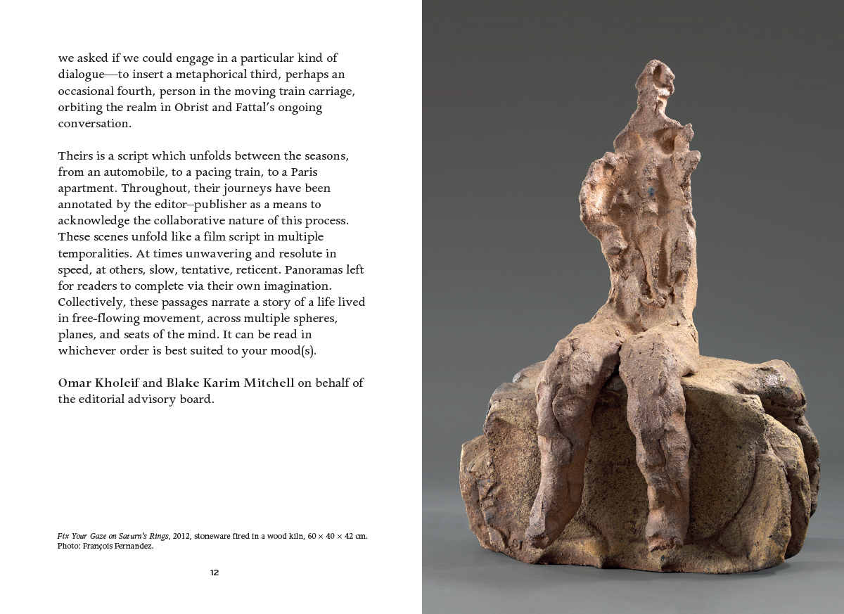 Prose and interviews between Fattal and Obrist are annotated and introduced by Dr. Omar Kholeif, whose essay helps situate Fattal’s multiple creative journeys. An afterword by author, curator and filmmaker, Rasha Salti entitled, Warrior Women Fall From a Low Height pulses, both in its lyricism and its expressive desire to solder and suture histories, once fractious, back together