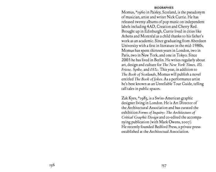 Published in the Solution Series, edited by Ingo Niermann, The Book of Scotlands will provide one answer—and a few more—to this appeal for focused dreaming about potential parallel world Scotlands. The author, Momus, is a Scottish artist who has lived in Paris, New York, Tokyo and now Berlin. Paradoxically, of course, there is nothing more Scottish than leaving Scotland. And the further a Scot travels from Scotland, the more vivid and lurid his “inner Scotlands” become—and the more tellingly they differ from the real place. 2009 will also see the publication of Momus’ first novel, The Book of Jokes.
