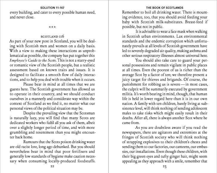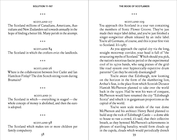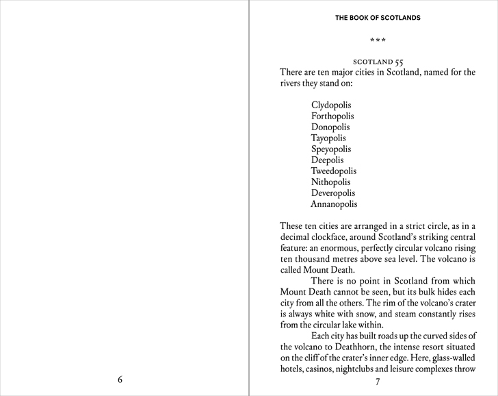 In the spirit of Italo Calvino, Bruno Schulz, and French animation series Les Shadoks (using any language, that is, except the “wooden tongue” of official discourse), The Book of Scotlands will outline, in a numerical sequence, one hundred and fifty-six Scotlands which currently do not exist anywhere. At a time when functional independence seems to be a real possibility for Scotland—and yet no one is quite sure what that means—a delirium of visions, realistic and absurd, is necessary.