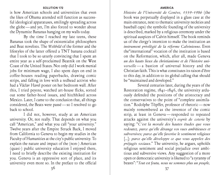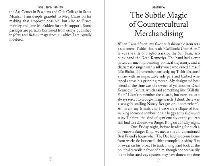 Solution 168–185: America is the fourth book in the Solution Series. Opting for the United States of America, “still the most proficiently colonial place I know,” Zolghadr provides a compilation of highly entertaining “solutions,” where the objective is not the education of America so much as the pleasure of a text that purports to be just that.
