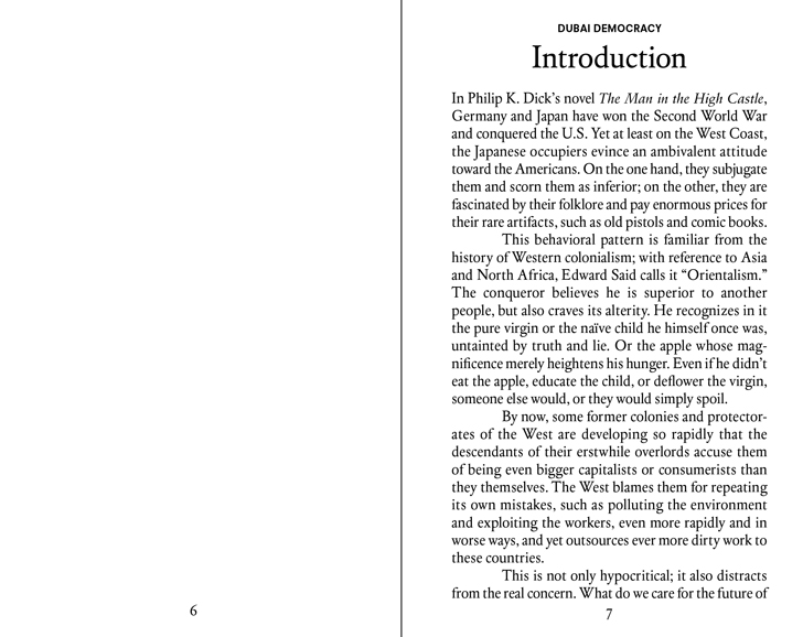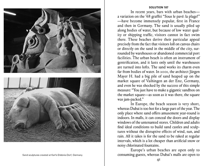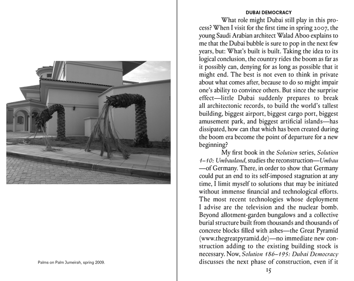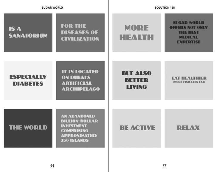 Solution 186–195: Dubai Democracy is the fifth book in the Solution Series. Using Dubai as a sort of modernist blank slate for urban and social renewal, author Ingo Niermann confronts today’s most relevant cultural and technological developments with analytical elixirs that are as pertinent as they are unbelievable. Niermann’s Dubai will become as specialized as housing the global center for treating diabetes—called Sugar World—and as universal as offering non-confrontational public spaces where both a state of total advertising and compulsive kindness, or what he calls a “personal humaneness account,” co-exist.