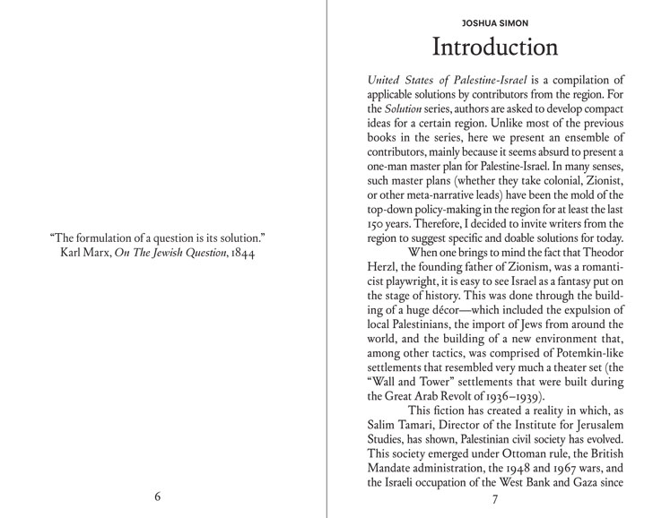 Solution 196–213: United States of Palestine-Israel is an anthology of texts proposing a doable solution for the region. With contributors based in Ramallah and Tel Aviv-Jaffa, Beirut and Jerusalem, New York and Bethlehem, Nazareth and Warsaw, the book offers solutions that will make life better, and proposes ways to do it.