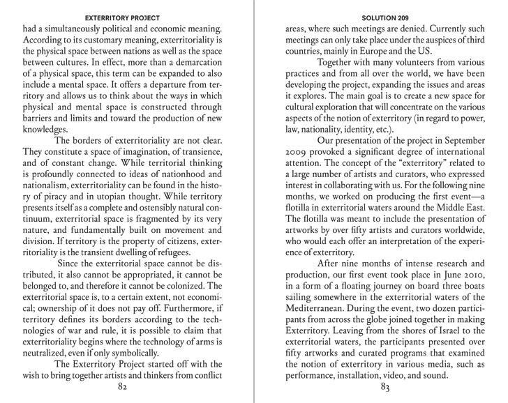 “Solution” is a tricky term especially in relation to the ongoing newspeak of the last two decades in Palestine-Israel. In their contributions for this book, Sandi Hilal, Alessandro Petti, and Eyal Weizman suggest revisiting the term “decolonization,” “in order to maintain a distance from the current political terms of a ‘solution’ to the Palestinian conflict and its respective borders. The one-, two- and now three-state solutions seem equally entrapped in a ‘topdown’ perspective, each with its own self-referential logic.”