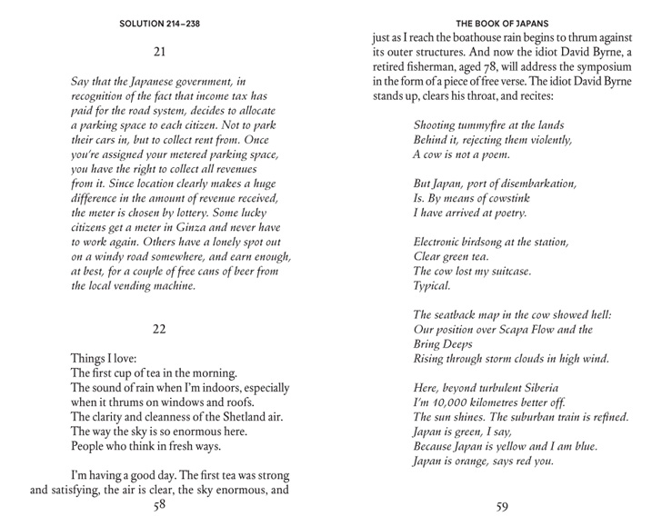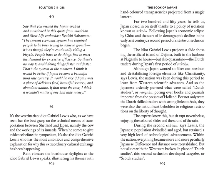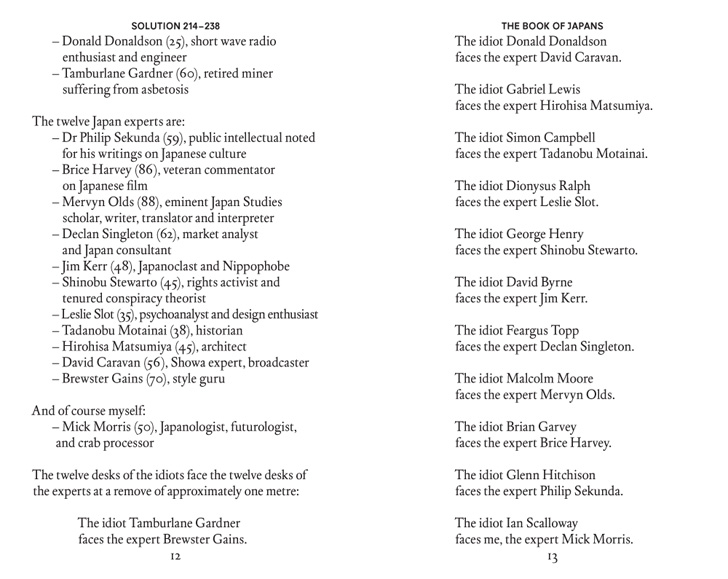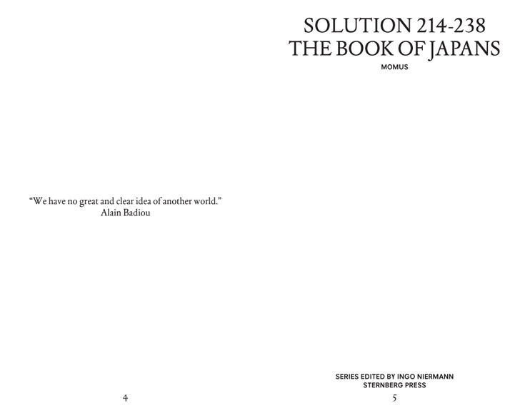Following the success of The Book of Scotlands (shortlisted for the Scottish Arts Council’s First Book prize), Momus has been commissioned to write another book as part of Ingo Niermann’s Solution Series. Solution Japan, or The Book of Japans, makes a case for the rehabilitation of the idea of the “far.” We live in a time when difference and distance have been eroded and eradicated by globalization, the Internet, and cheap jet travel. The Book of Japans restores a sense of wonder—along with a plethora of imagination-triggering inaccuracies—by taking the reader on a trip not just through space but also time.