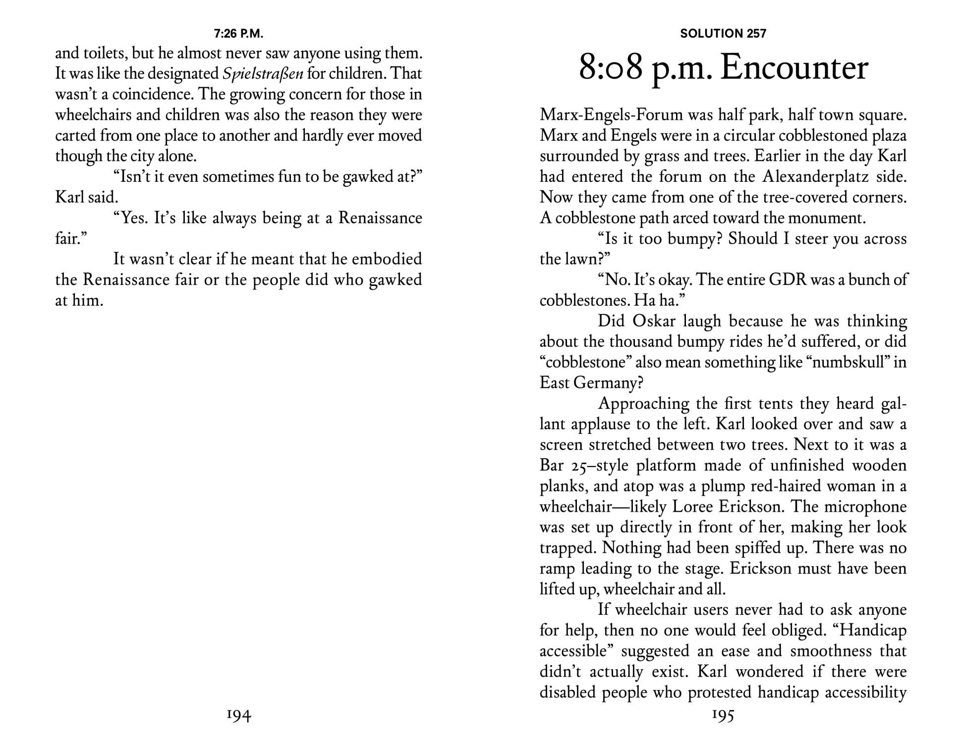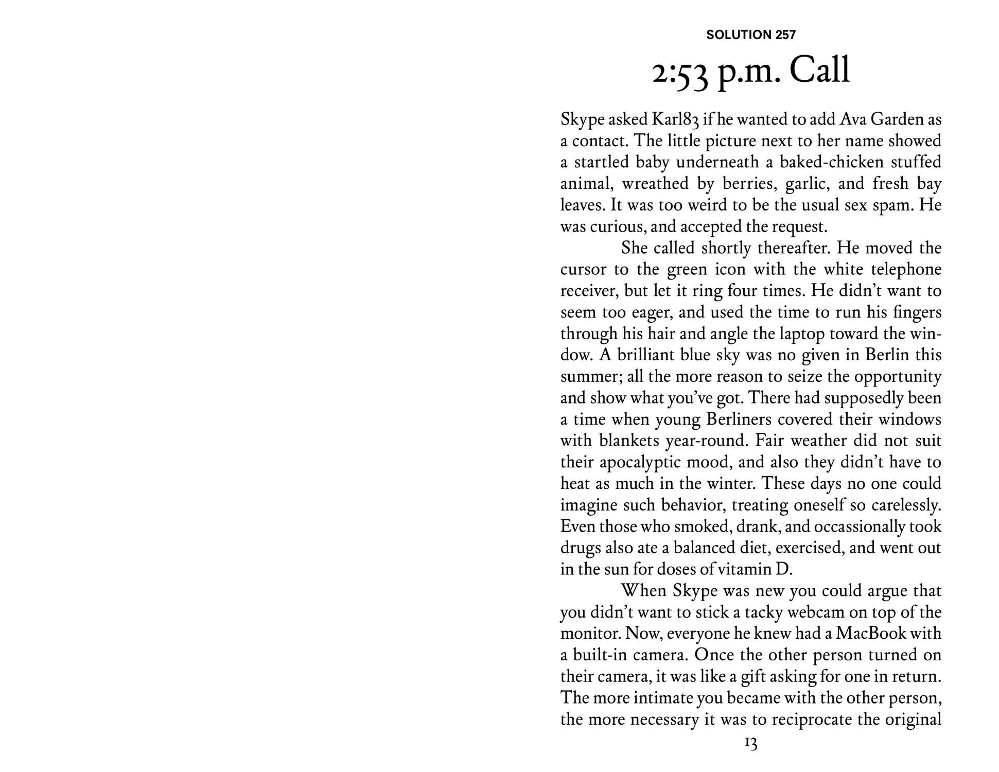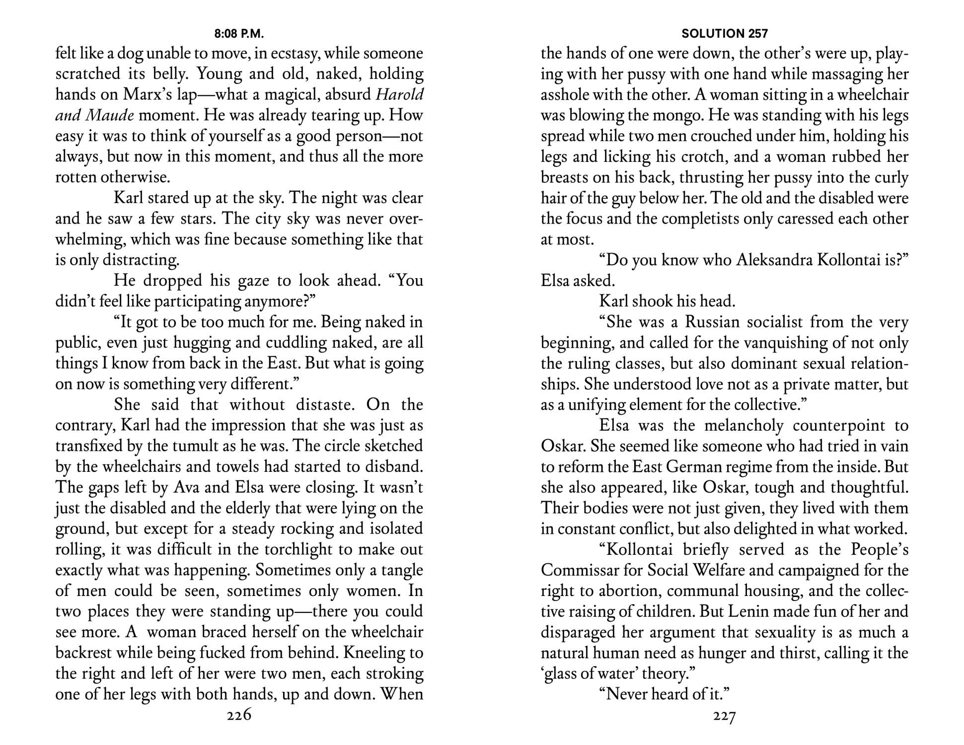 Ingo Niermann’s provocative new novel imagines a Berlin alternative to the activist occupation of public spaces in 2011. The completists, gathered at Alexanderplatz, aspire for justice through intimacy. They believe that only when the redistribution of material wealth includes equal chances of finding sex and love—no matter how elderly, disabled, or ugly you are—communism will become real. This volume of the Solution Series is a revolutionary erotic fiction.