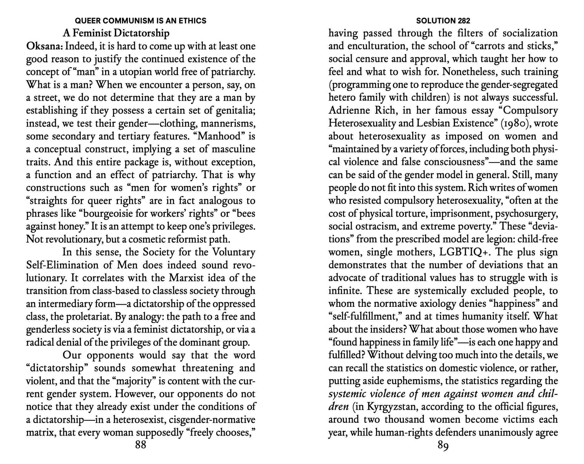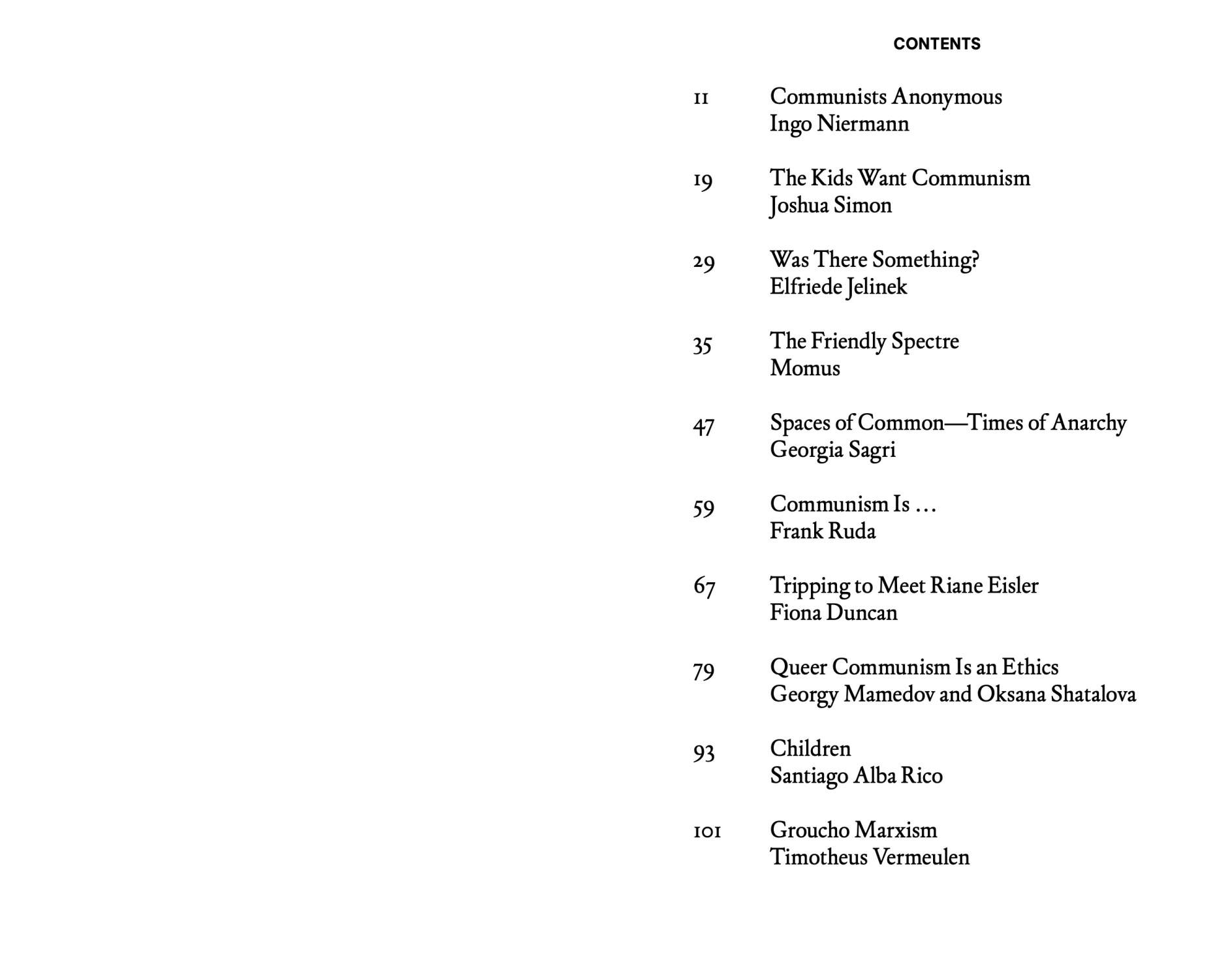 Solution 275–294: Communists Anonymous is a document of some imageries of communism and a testament to the current predicament of our political imagination. Atomized, privatized, and deprived of any infrastructure for solidarity—without any internationalist project, with moralizations compensating for the disappearance of political organization, with micro-politics replacing macro-politics—communists can only be anonymous in this world of ours. Edited by writer Ingo Niermann and curator Joshua Simon, this collection of essays and stories—written from the fields of art, literature, law, philosophy, activism, design, and science—proposes resolutions to current social contradictions, covering topics such as bacteria, bliss, immortality, queerness, interculturality, poetry, transportation, childhood and motherhood, and all-encompassing sensual love.