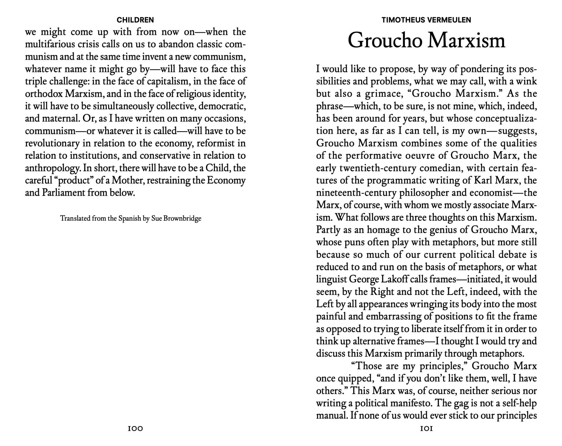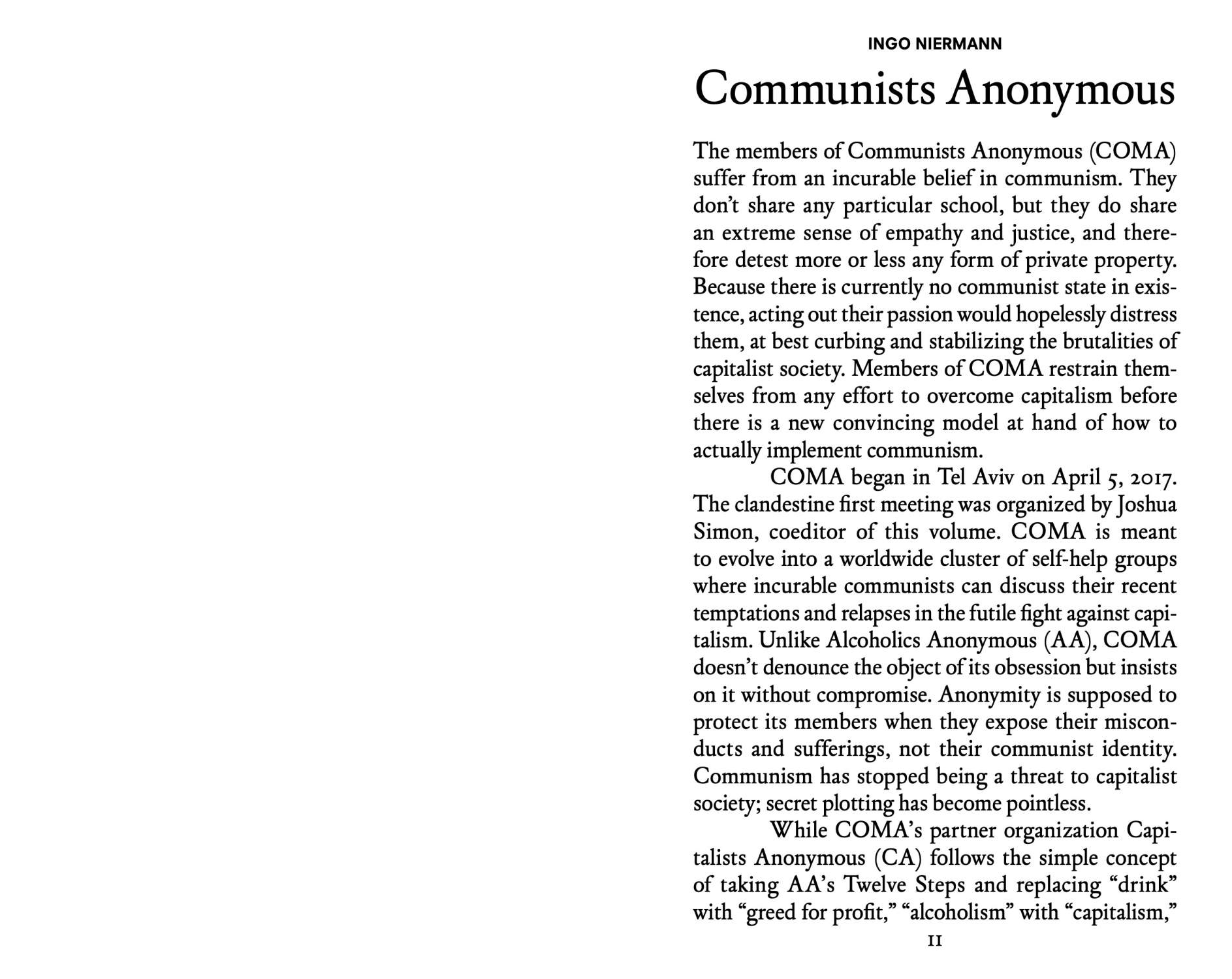 The members of Communists Anonymous (COMA) share an extreme sense of empathy and justice, and therefore detest more or less any form of private property. COMA members restrain themselves from any effort to overcome capitalism before there is a new convincing model at hand of how to actually implement communism. The speculative self-help of COMA understands the historical incarnations of communism as substantially incomplete in thought and practice, and places communism where it originated—in the realm of fiction. Only as fiction can communism manifest itself again beyond doubt.