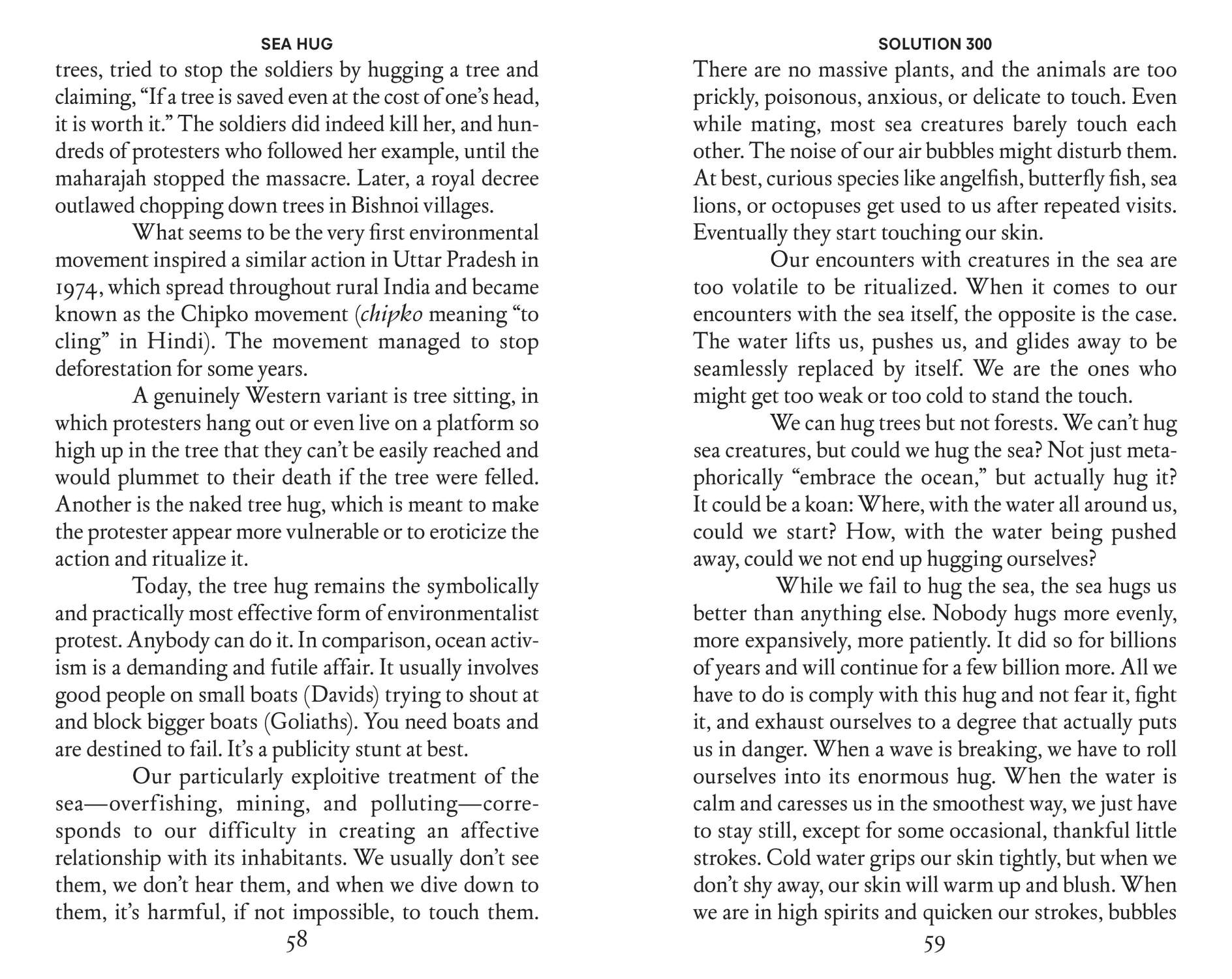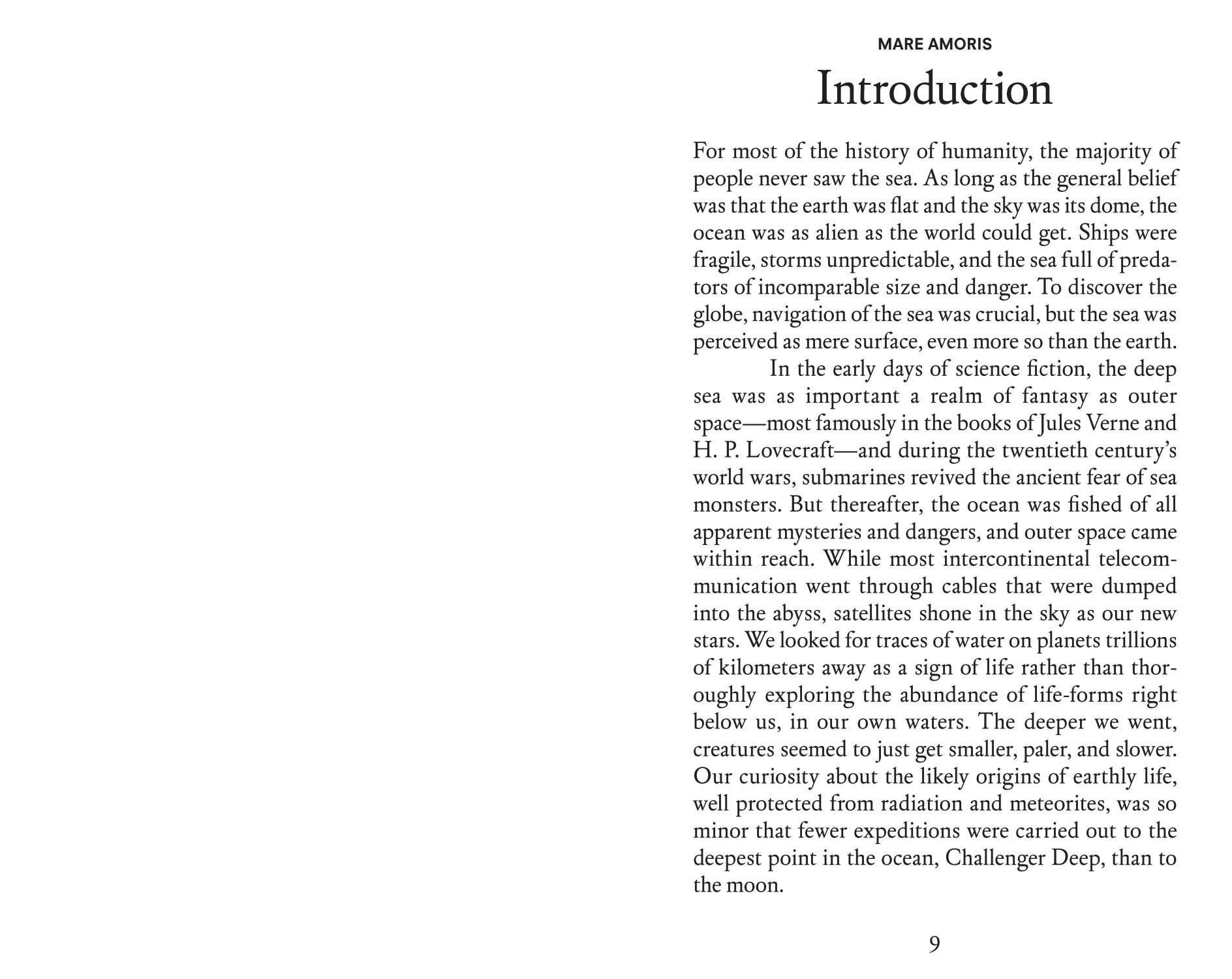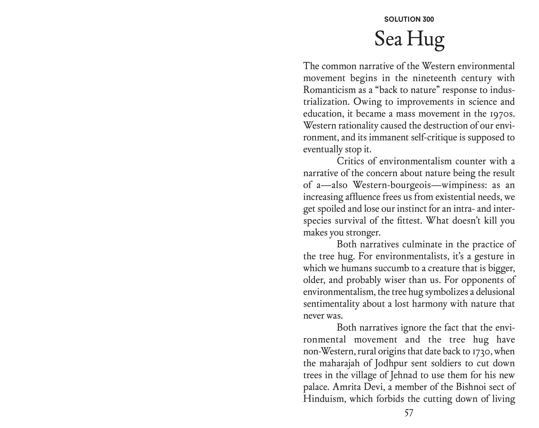It was the concept of the ocean as a global commons, free for everyone—first formulated by Hugo Grotius in his 1609 treatise, Mare Liberum—that stimulated a free global market. Today, the free market and the free ocean both suffer from rigorous, exploitive use. A new concept of how to relate to the ocean could transform the global economy and global politics. Solution 295–304: Mare Amoris proposes new practical, technological, and metaphysical scenarios of how to fall in love with the sea, and, eventually, have the sea fall in love with us.