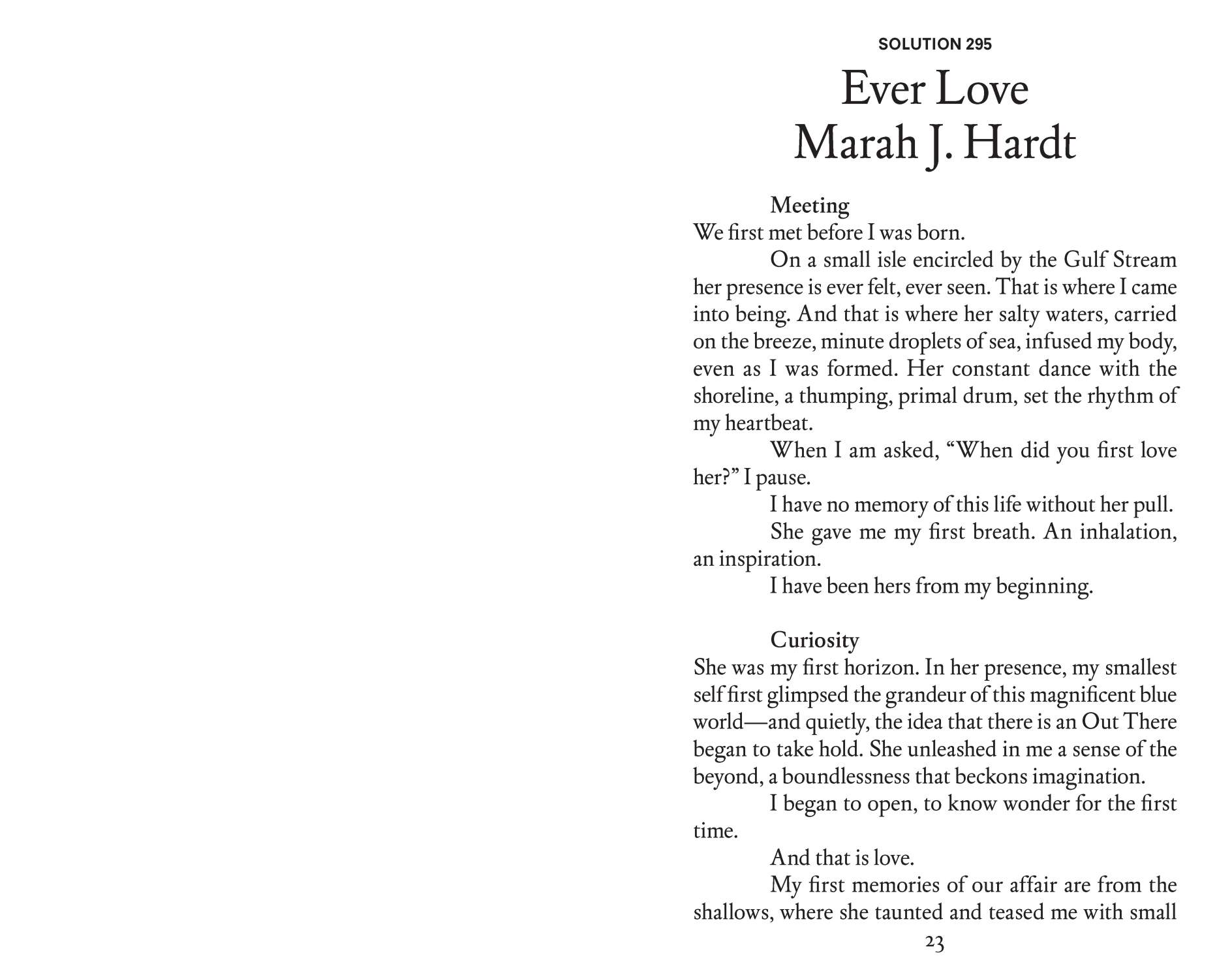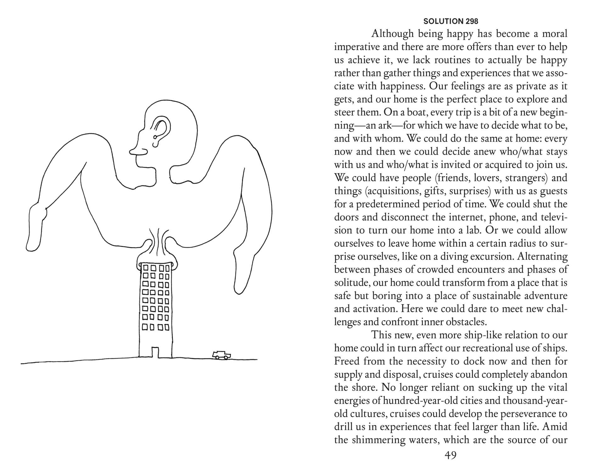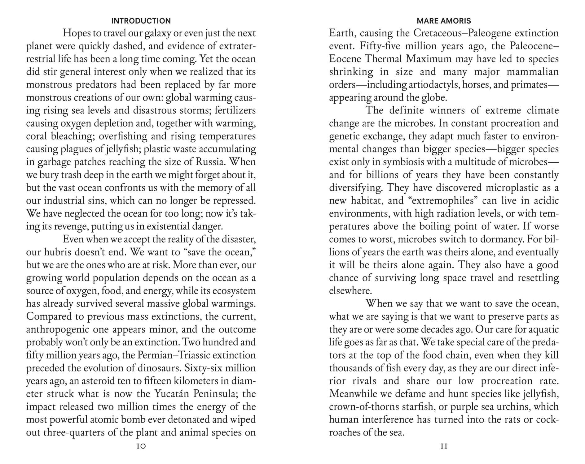 It was the concept of the ocean as a global commons, free for everyone—first formulated by Hugo Grotius in his 1609 treatise, Mare Liberum—that stimulated a free global market. Today, the free market and the free ocean both suffer from rigorous, exploitive use. A new concept of how to relate to the ocean could transform the global economy and global politics. Solution 295–304: Mare Amoris proposes new practical, technological, and metaphysical scenarios of how to fall in love with the sea, and, eventually, have the sea fall in love with us.