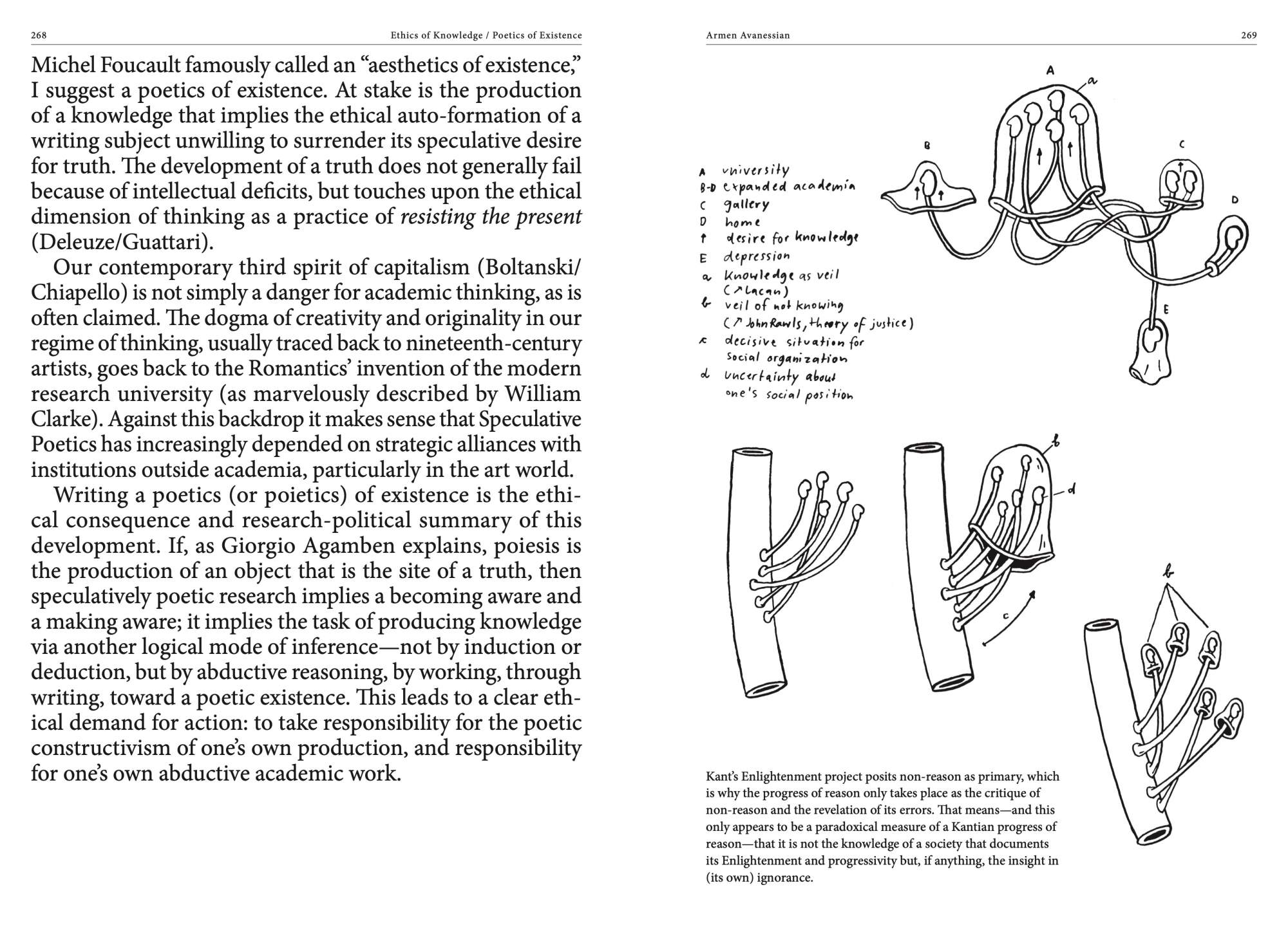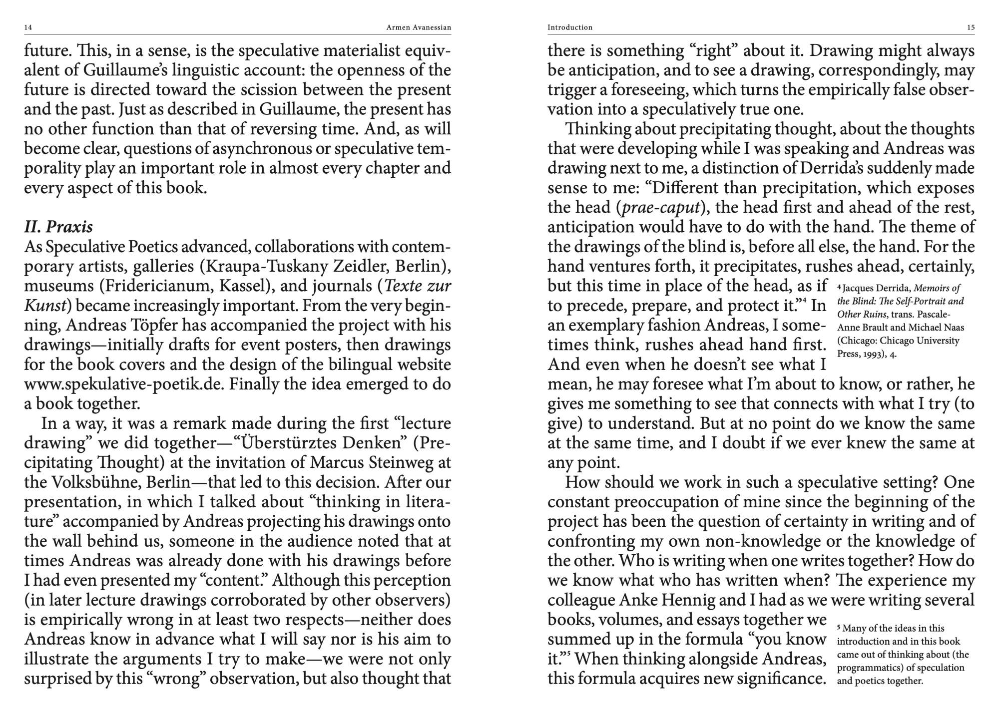 Speculative Drawing presents fifteen books—from monographs and translations to collections of essays—that emerged from the research platform Speculative Poetics, conceived by Armen Avanessian in 2011. This book gives a somewhat different introduction to contemporary speculative philosophy, raising questions on how thinking works and how thinking occurs in drawings or illustrations. How does a poetic thinking work that’s not about but with art?