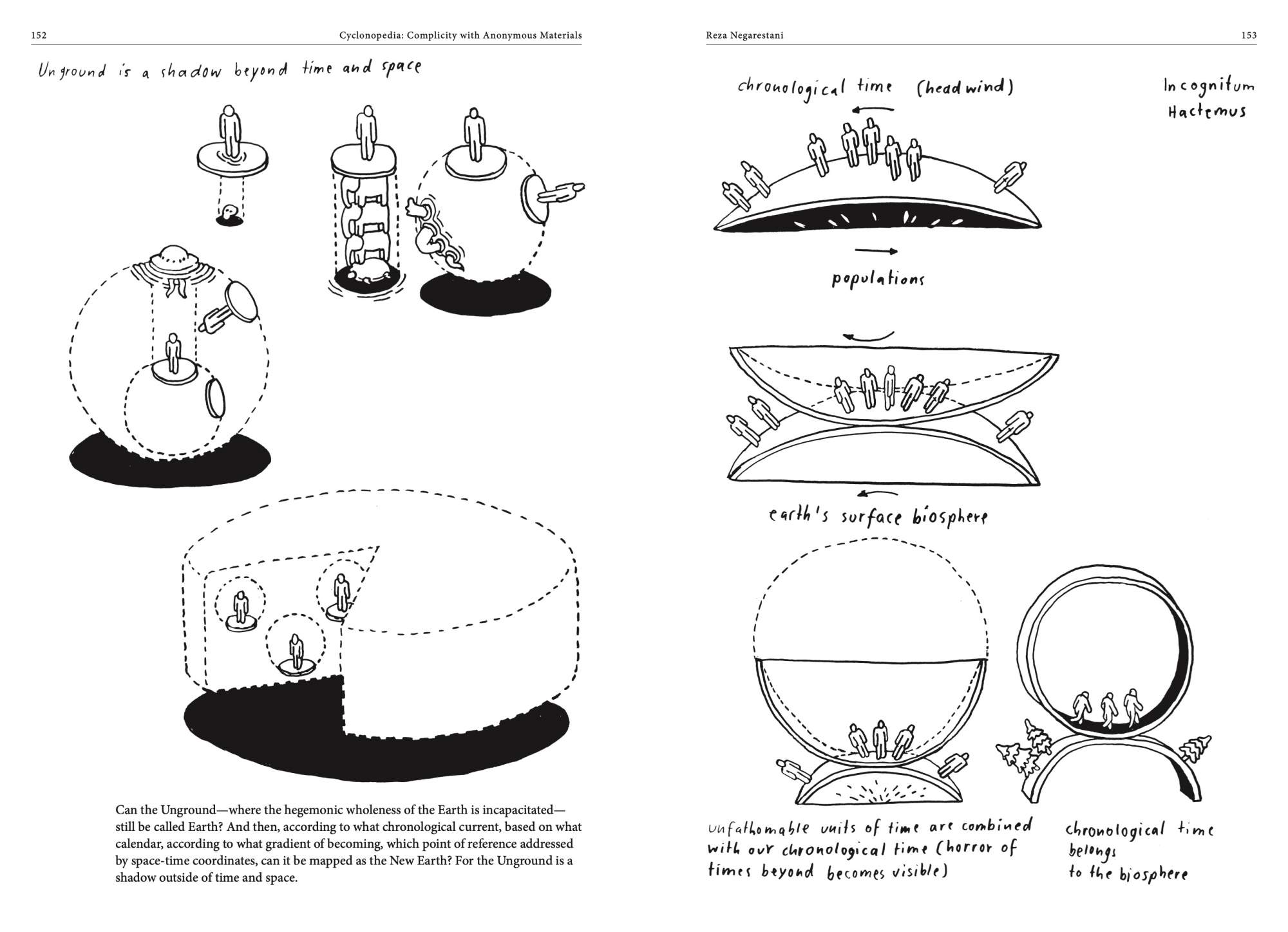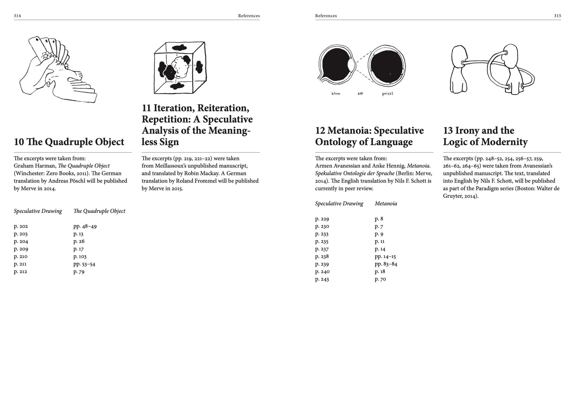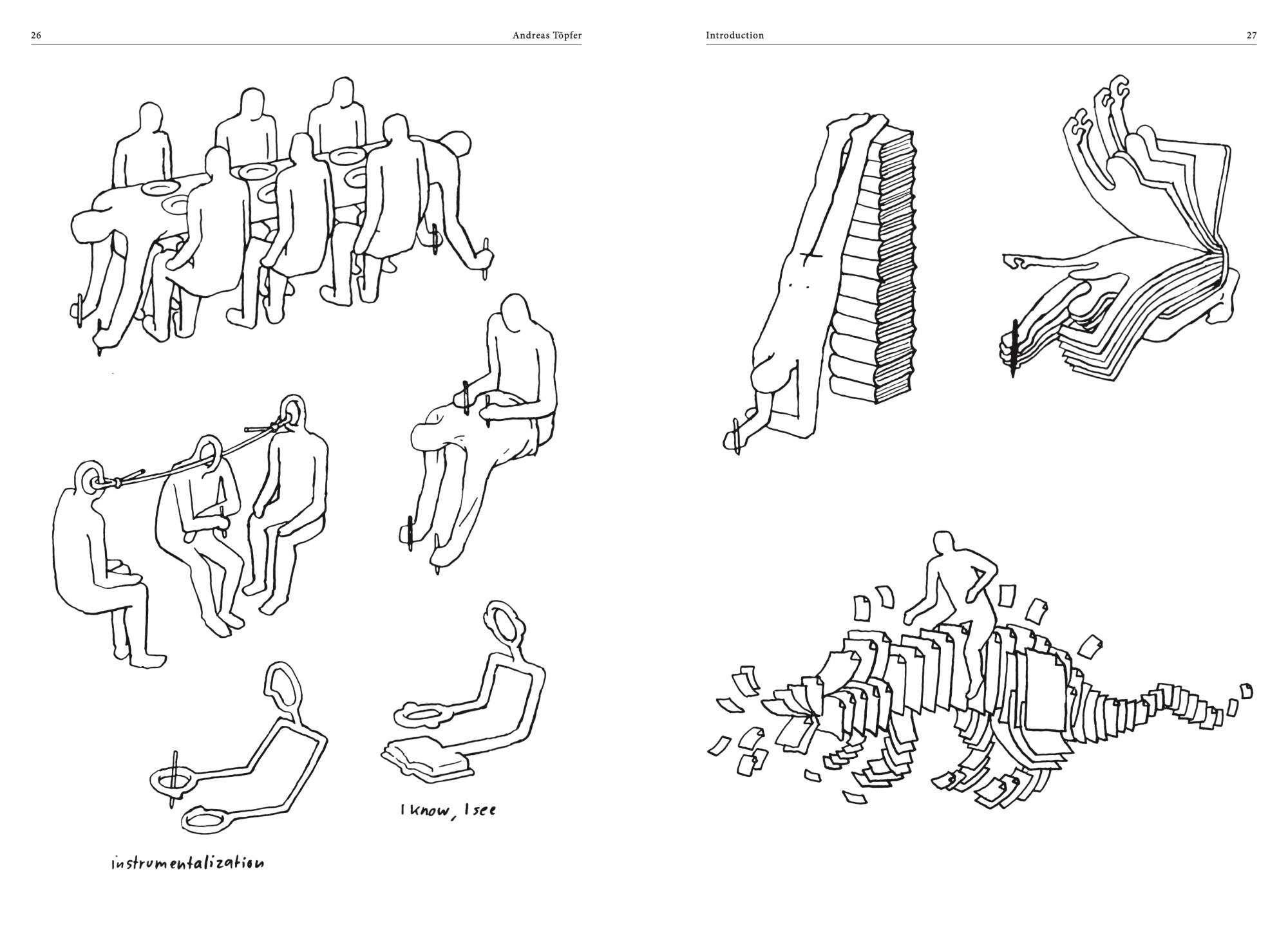 Andreas Töpfer’s drawings in this book are not illustrations of the texts. Rather it’s the other way around: they need to be read so that the texts can start to refer to them. In this sense, Speculative Drawing does not provide a shortcut to the theories presented; it does not aim to build a representational relationship between a pictorially correct understanding and a correlative conceptual thought. Instead, the drawings provide an occasion to think about thinking—a speculative thinking and writing in concept and through images.