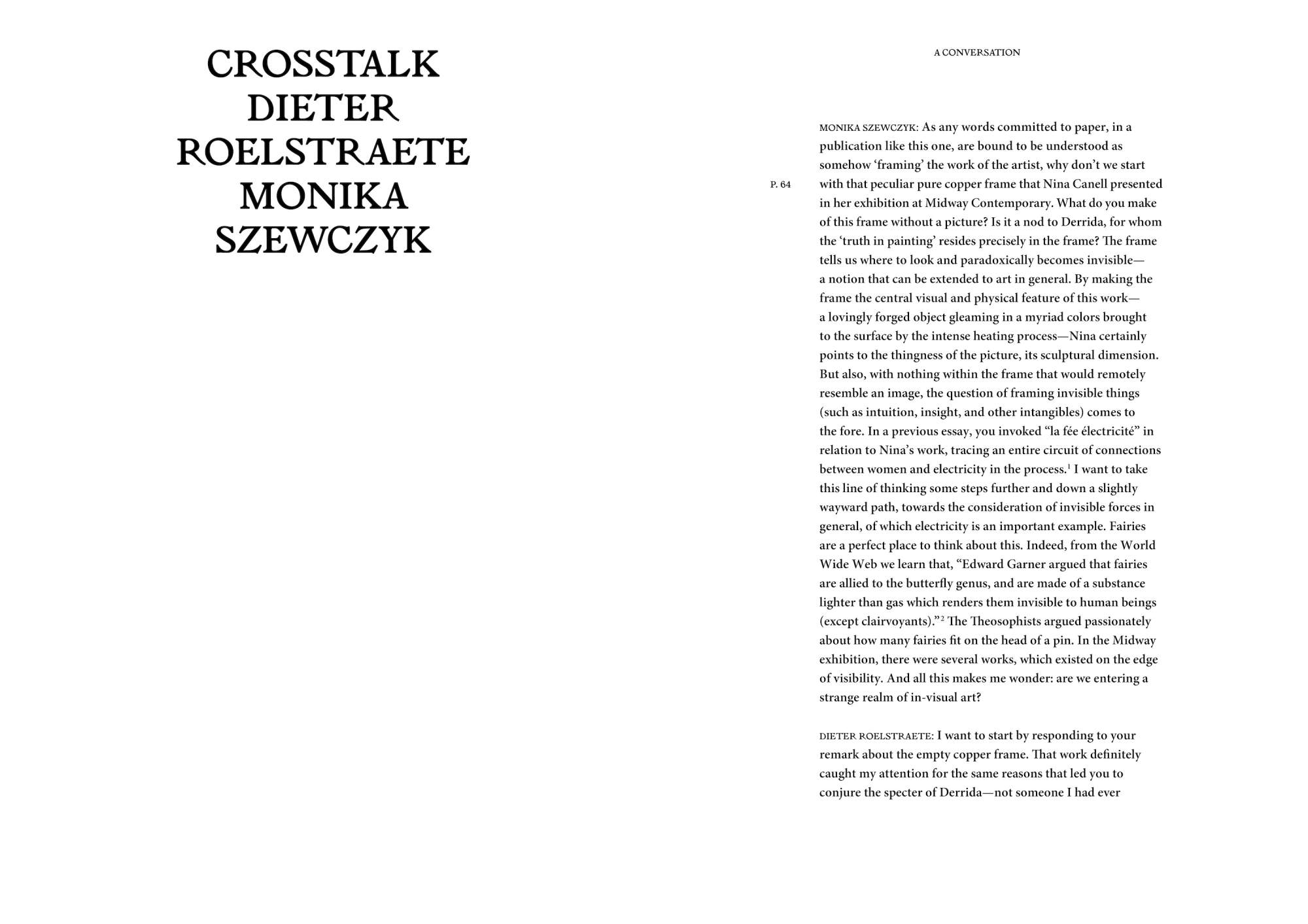 The text contributions are comprised of a conversation between Dieter Roelstraete and Monika Szewczyk on the topic of communication, followed by an essay by Steven Connor on the consistency of words, imagination, and thought itself.