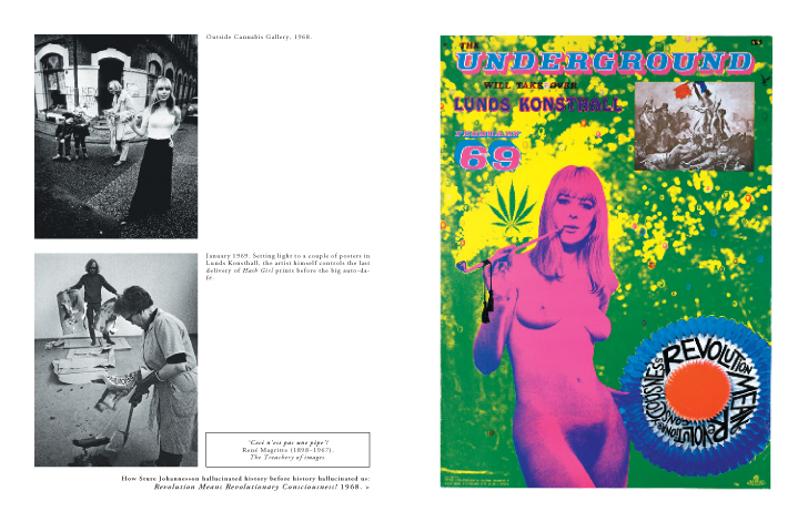 In the sixties, Sture Johannesson’s psychedelic posters upset both the Swedish authorities and the “serious” left wing with their delirious drug politics. His pioneering body of work developed throughout the seventies and eighties, capturing the zeitgeist of three decades. More importantly, Johannesson’s posters, happenings, and experiments with new media – electronic as well as narcotic–demonstrated that the way authority programs society is more hallucinatory than any drug could ever be.