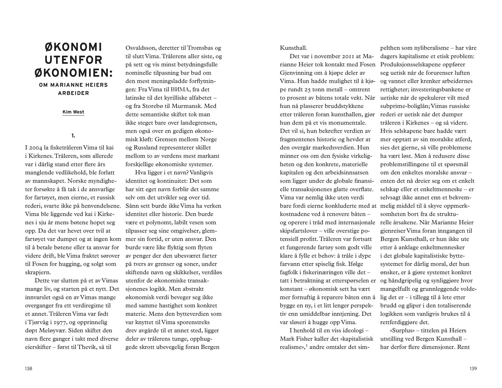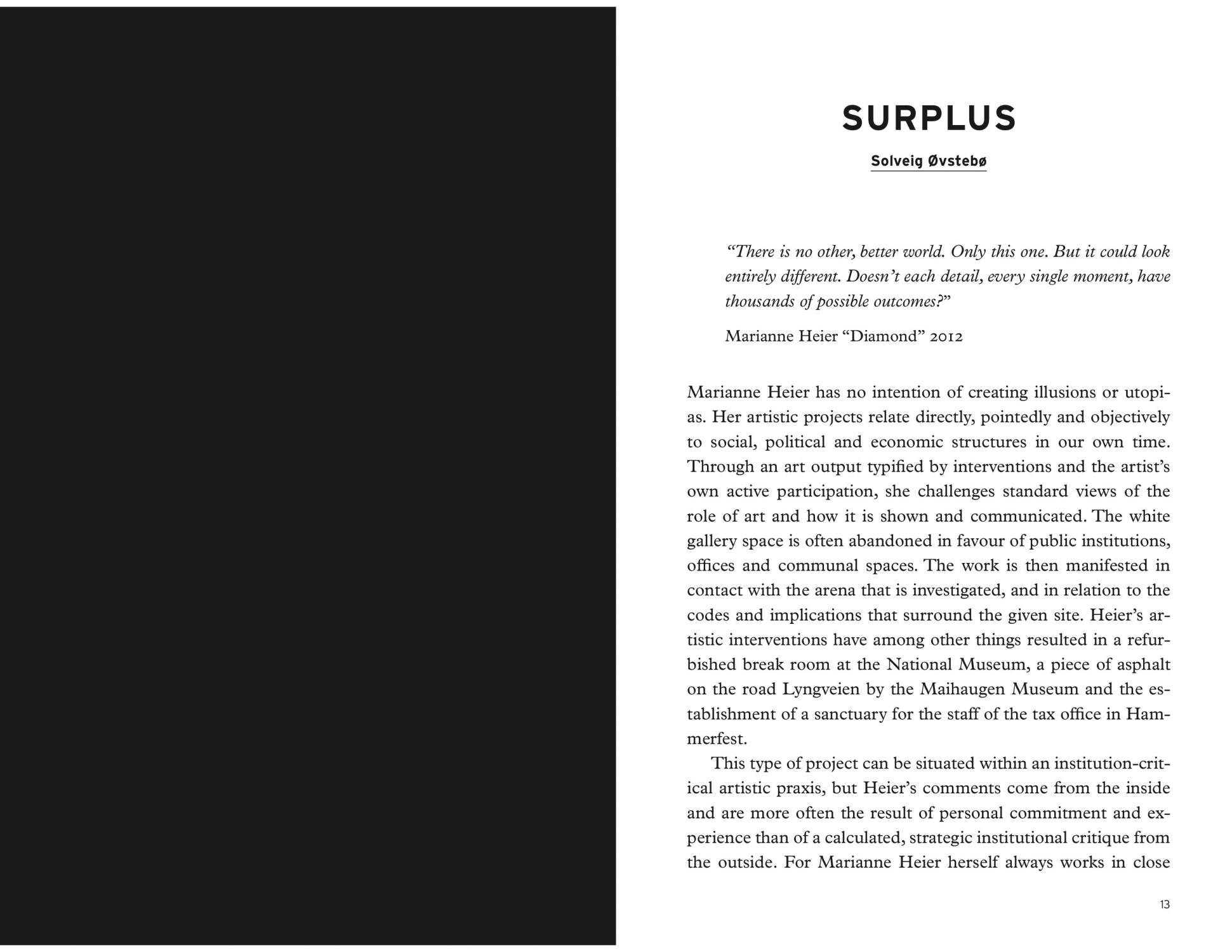 Through “Surplus,” an extensive physical intervention in front of Bergen Kunsthall, Heier demonstrated an unbudgeable faith that art has a value different from the one that can simply be negotiated on a market. Surplus can, from this perspective, also refer to a kind of “surplus value.”