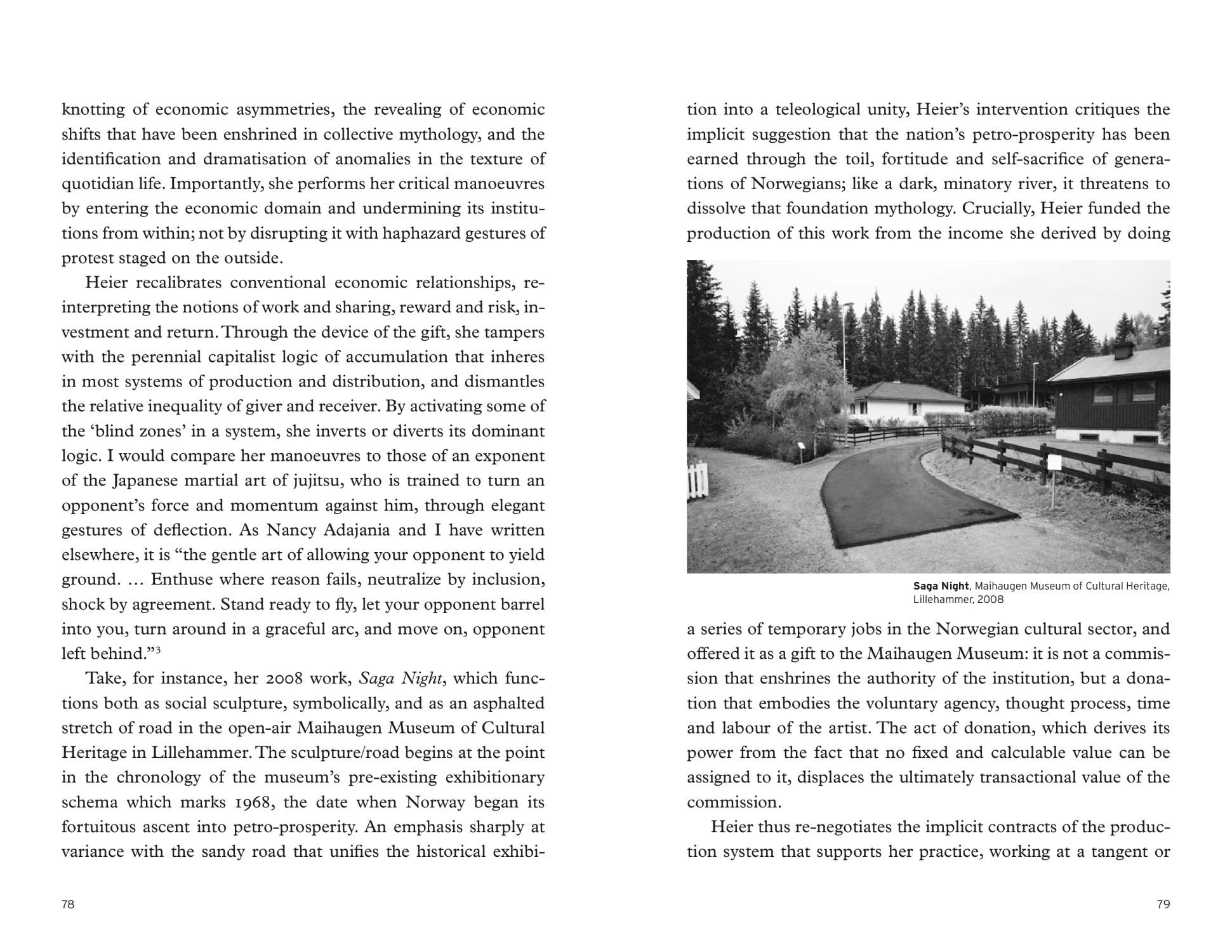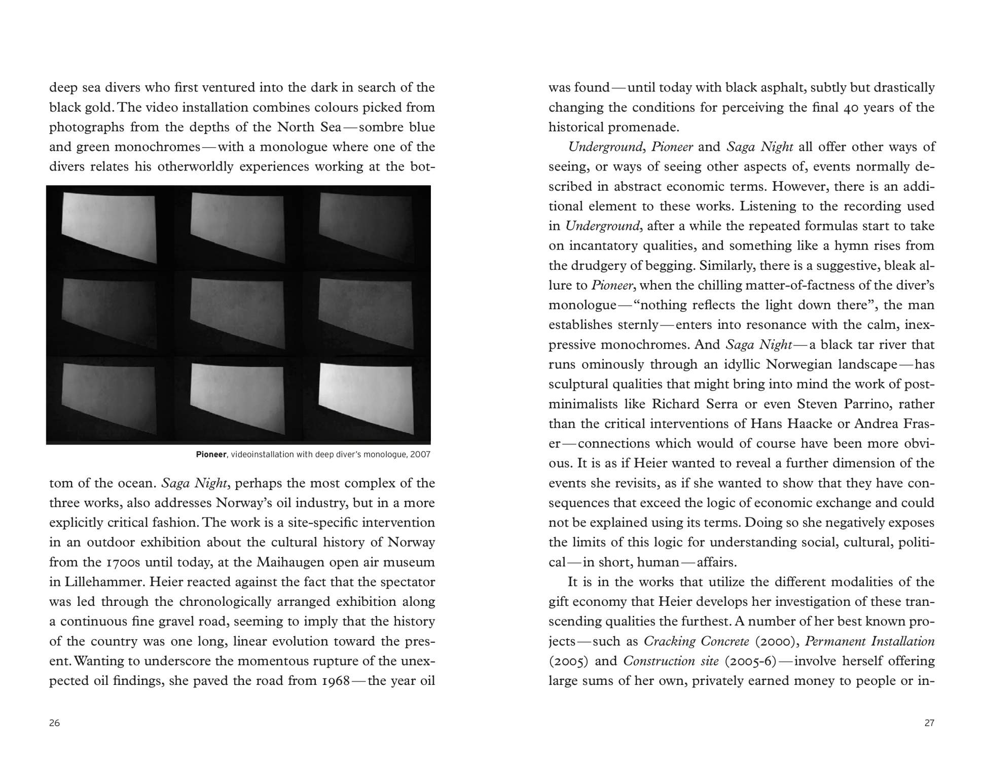 This publication builds on Heier’s investigative process. Instead of a retrospective analysis of her oeuvre, contributions by writers and researchers from various disciplines have become an important part of the exhibition project in their own right. The project renders visible societal structures and consequences of such structures—of which we are not always aware. By shifting the perspective slightly, we can perhaps glimpse distinct values and new outcomes.