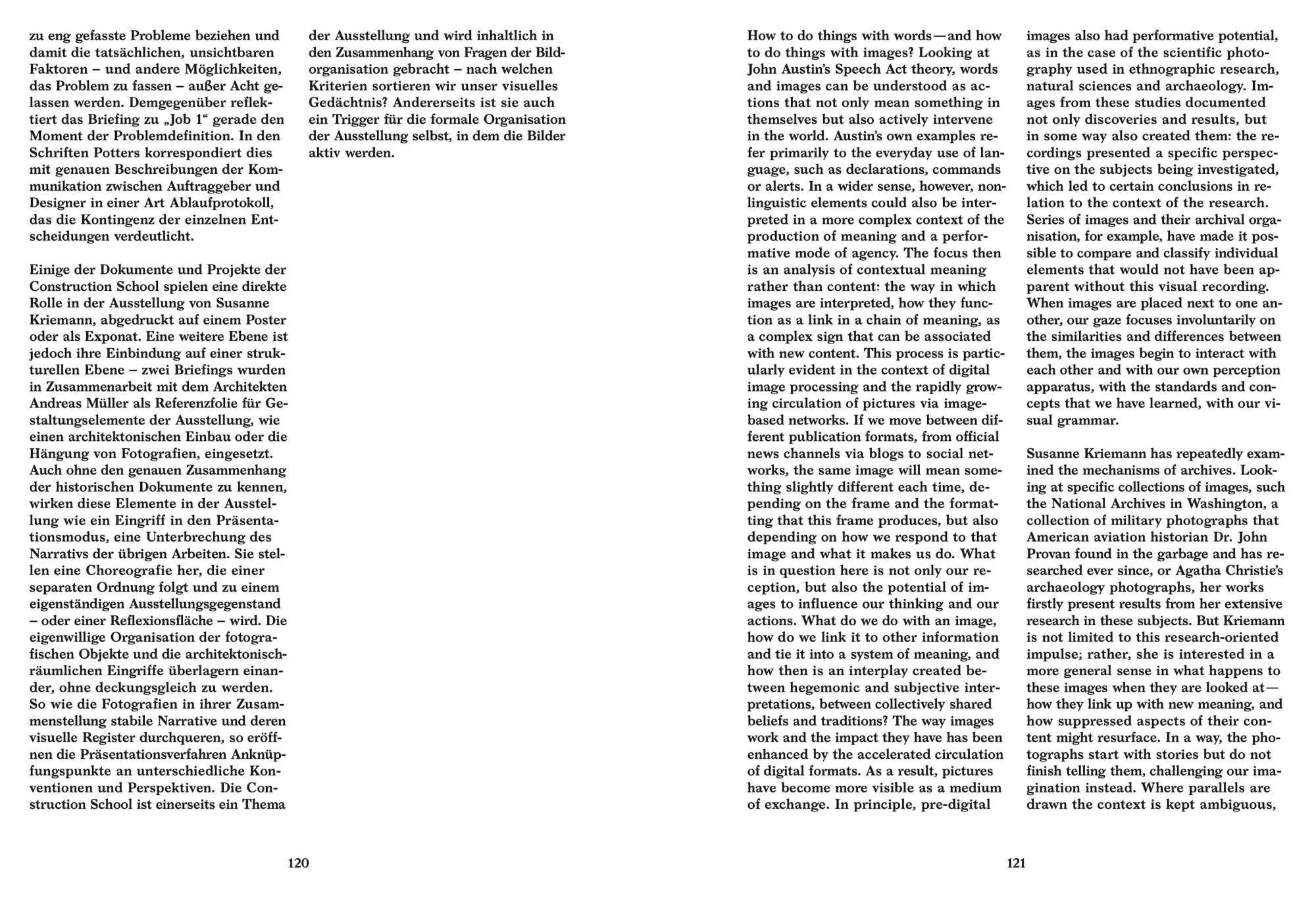 This publication was created as part of the solo exhibitions “Cold Time” at the Kunstverein Braunschweig and “Modelling (Construction School)” at Arnolfini in Bristol. Even if the exhibitions were organized entirely independently of one another, the joint effort in producing this catalogue made it possible to go beyond simple exhibition documentation and provide a more in-depth view into the work of Kriemann. In a certain sense, this catalogue is connected to the artist’s earlier publication entitled Reading Susanne Kriemann (Sternberg Press, 2011), consisting exclusively of texts. Here, however, the main point of the publication is to let the images speak for themselves.