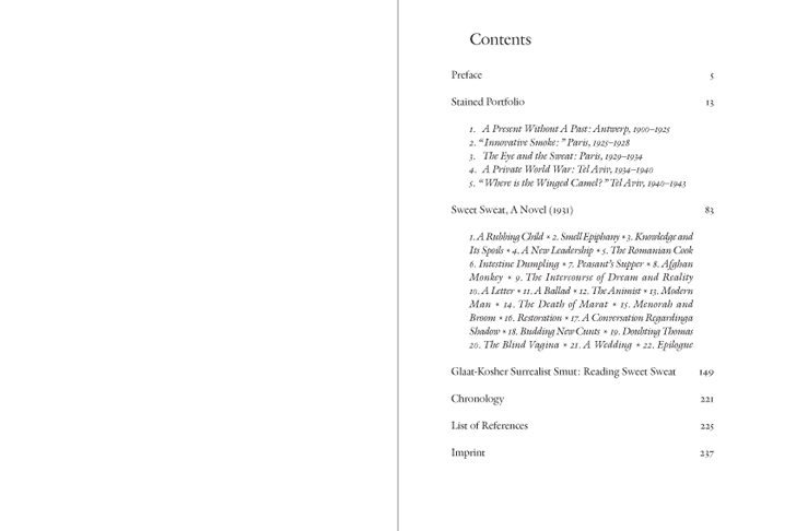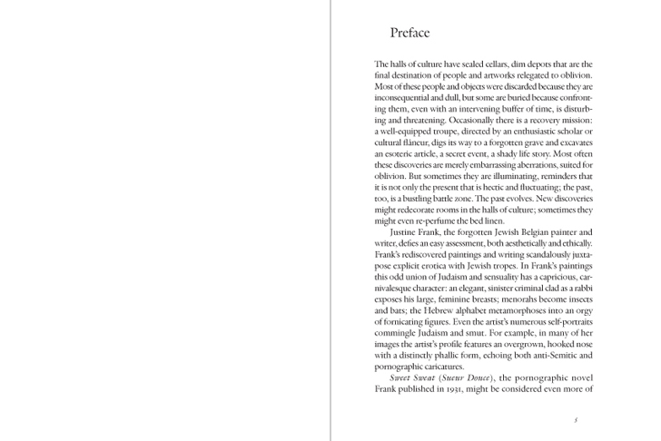 Sweet Sweat, the only novel by Belgian artist Justine Frank, is unusual, to say the least—a blend of feminism, pornography, Judaism, and art, written in French in 1931. Its heroine is a Jewish girl named Rachel, born in the South of France, who has an outstanding talent for debauchery and crime. She takes up with the sybaritic Count Urdukas and sets out with him on an odyssey of pleasure and corruption marked by bizarre events in which horror and humor mingle. This comprehensive new edition of Frank’s novel includes an essay and an extensive biography by Israeli American writer and artist Roee Rosen and a timeline tracing key moments in Frank’s life, providing a definitive analysis of this once-scandalous novel and its historical and cultural contexts.