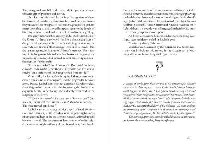 [As he hovered] over the skinny body, his nostrils were filled with the aroma of horror-sweat that poured from Rachel. He was swept by the scent. His breathing became a guttural purr and his eyes glazed over. Oh, shrewd liqueur of tropical fruits!