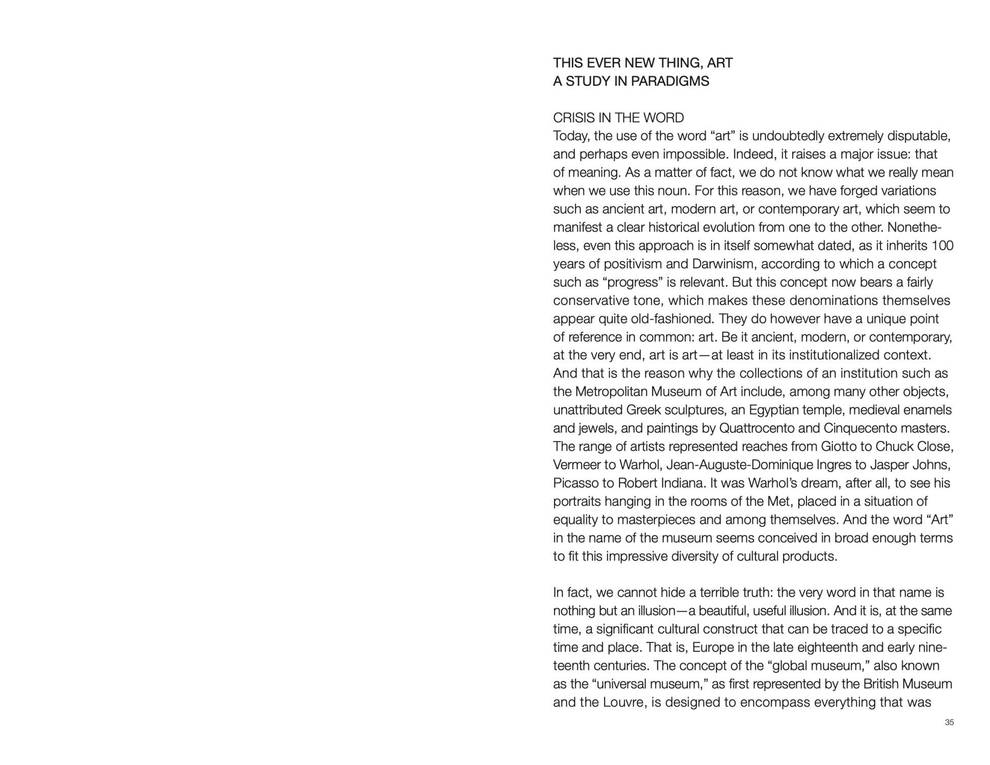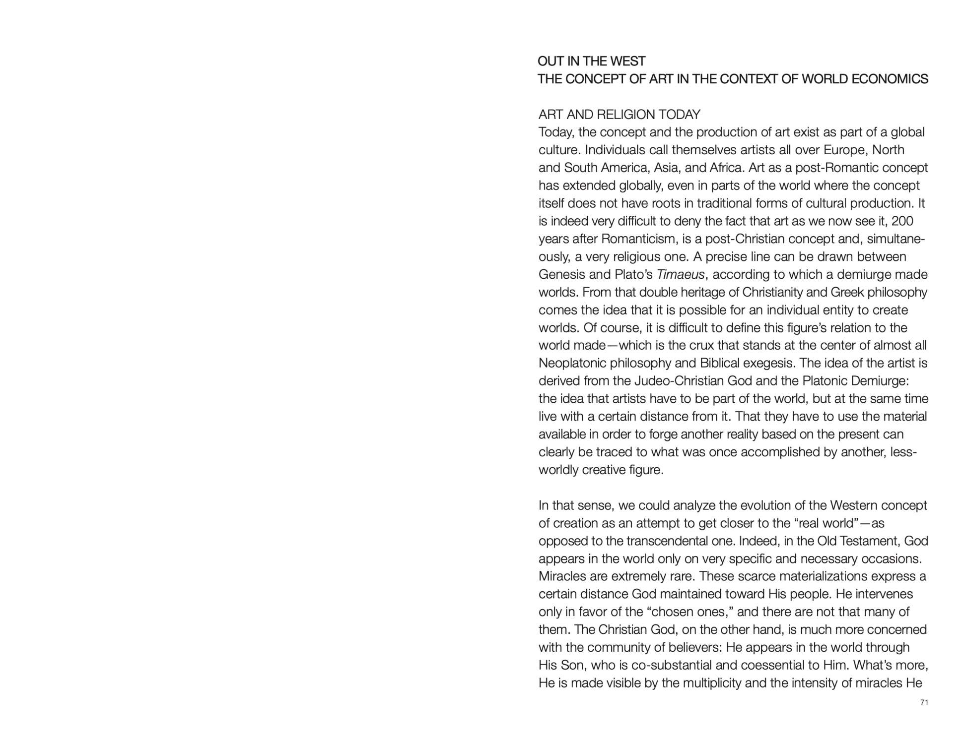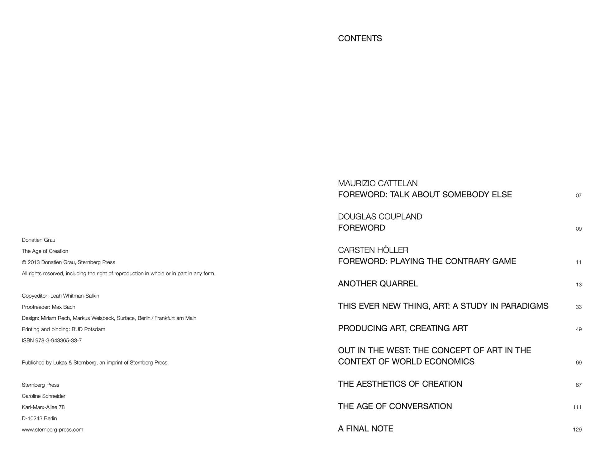 The Age of Creation analyzes the entrance of art into culture at large. Since so much art now considers itself as cultural production, mystical creation has been turned into a minority paradigm. Creation does not intend to embrace culture, but actually to address it and engage in a conversation between the world and its participants. As such, it paves the way for a perpetual reinvention of human life.