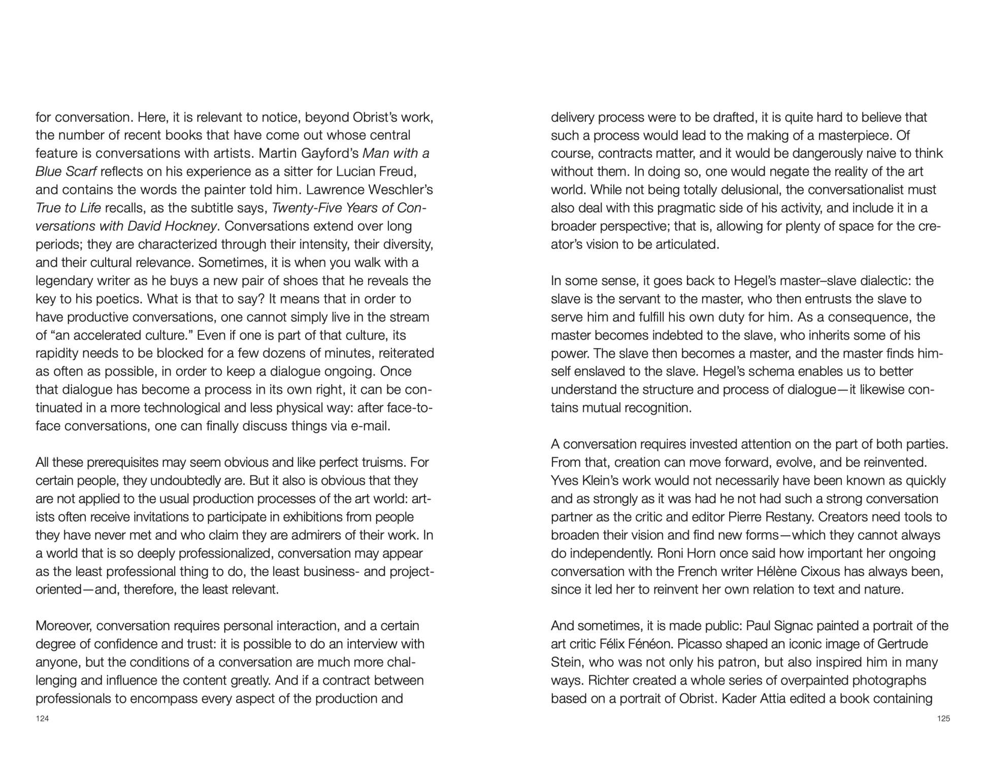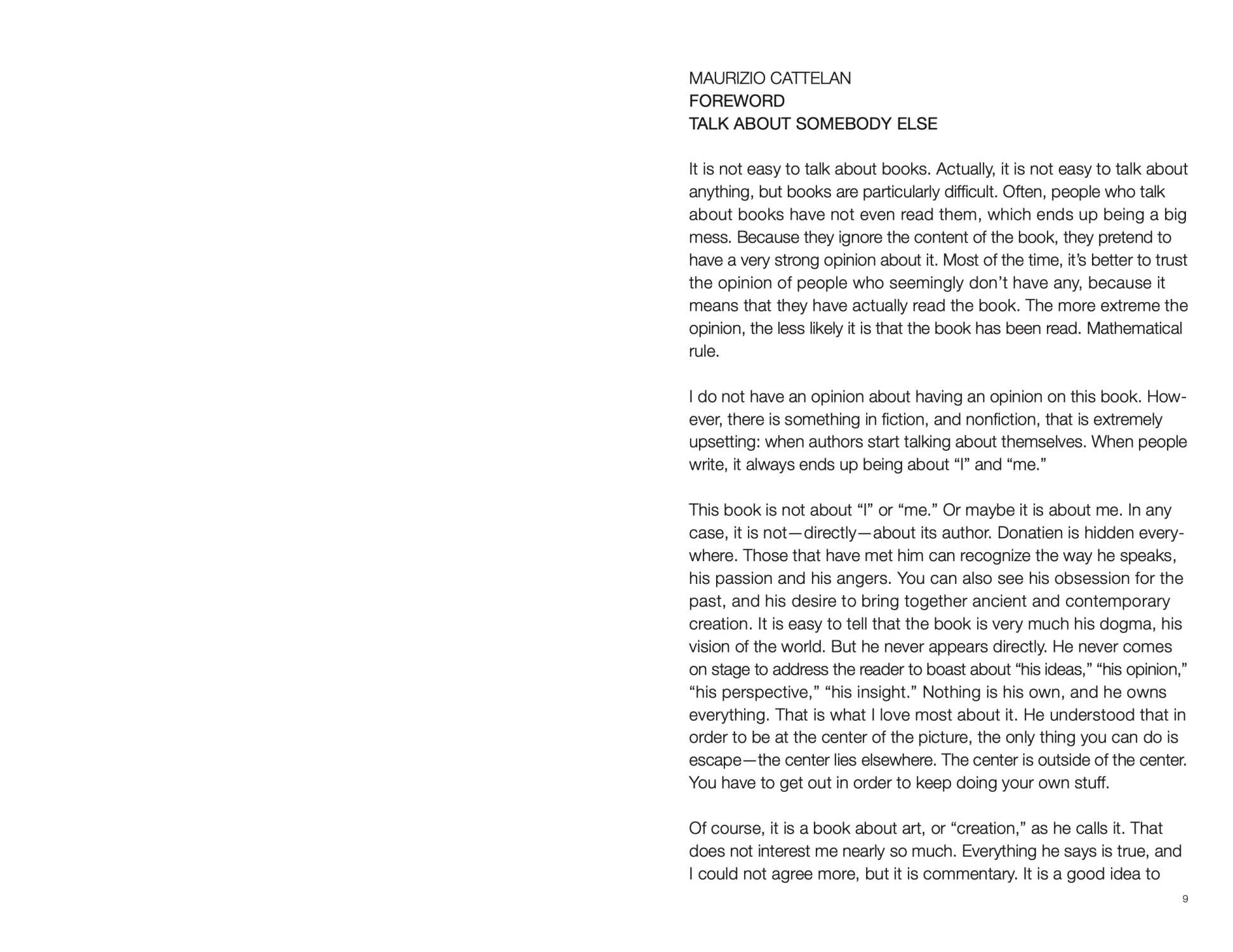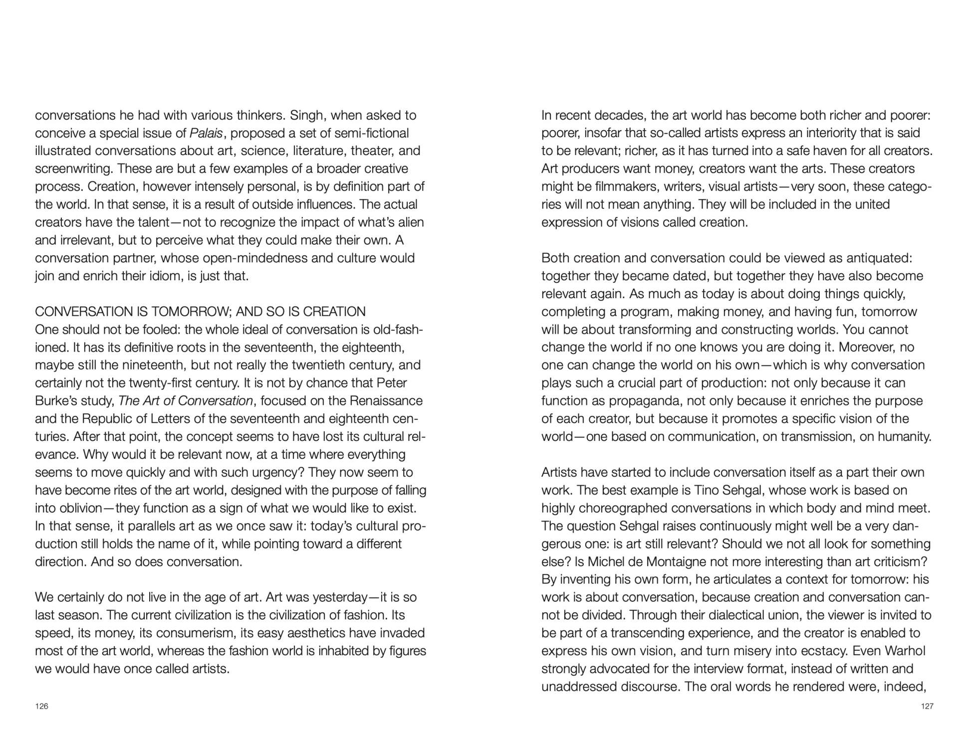 The Age of Creation analyzes the entrance of art into culture at large. Since so much art now considers itself as cultural production, mystical creation has been turned into a minority paradigm. Creation does not intend to embrace culture, but actually to address it and engage in a conversation between the world and its participants. As such, it paves the way for a perpetual reinvention of human life.