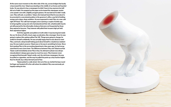The bilingual (English/Arabic) book includes five short stories based on observation that engage the reader with very particular yet uncannily recognizable characters and occurrences. This sense of recognition emanates from a certain quality the stories embody rather than in any specific details they convey. The specific cultural, aesthetic, and personal sensibility through which the stories are filtered is further revealed when considered in relation to the accompanying images of sculptural objects explicitly produced for this purpose and based on the demotic style of popular kitsch ornaments.