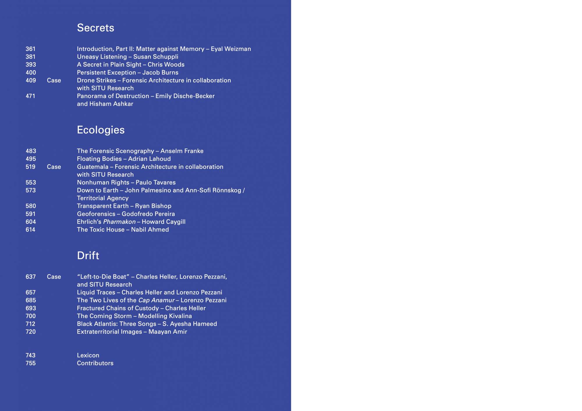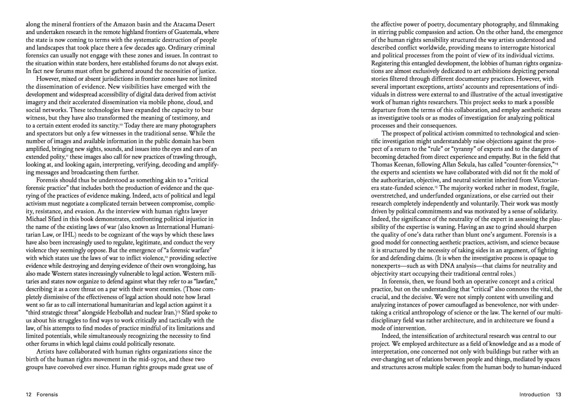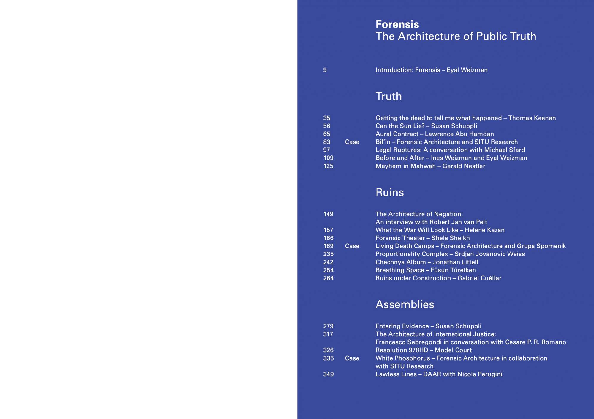 This book presents the work of the architects, artists, filmmakers, lawyers, and theorists who participated directly in the “Forensic Architecture” project in the Centre for Research Architecture at Goldsmiths University of London, as well as the work of associates and guests. It includes forensic investigations undertaken by the project and its collaborators aimed at producing new kinds of evidence for use by international prosecutorial teams, political organizations, NGOs, and the UN. It also brings together research and essays that situate contemporary forensic practices within broader political, historical, and aesthetic discourse.