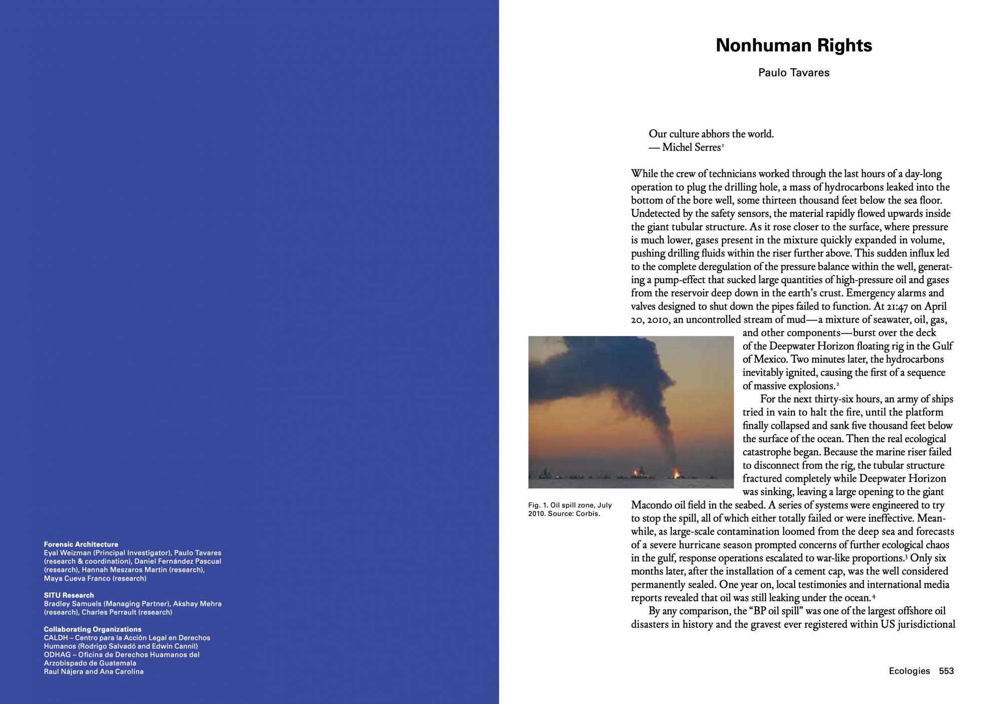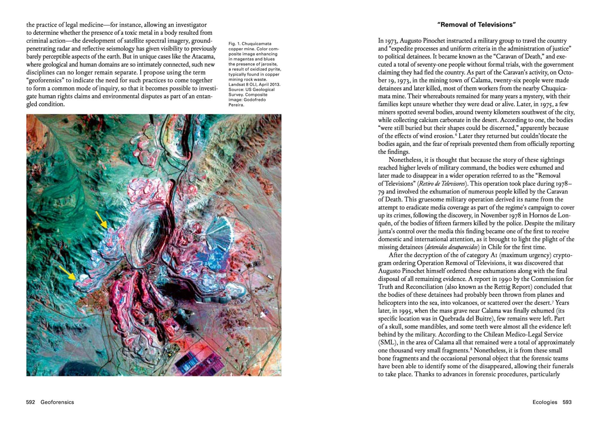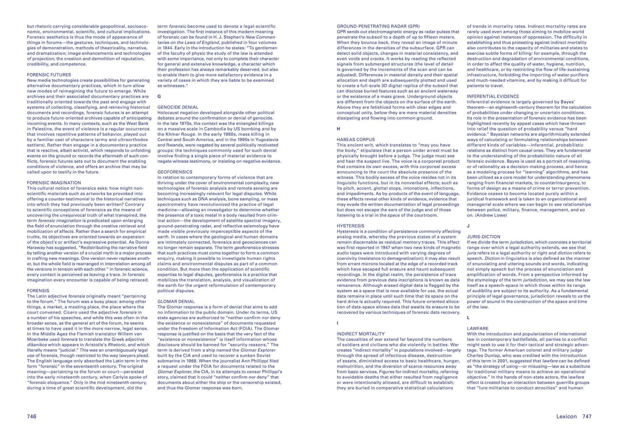 The condition of forensis is one in which new technologies for mediating the “testimony” of material objects—bones, ruins, toxic substances, landscapes, and the contemporary medias in which they are captured and represented—are mobilized in order to engage with struggles for justice, systemic violence, and environmental transformations across the frontiers of contemporary conflict.